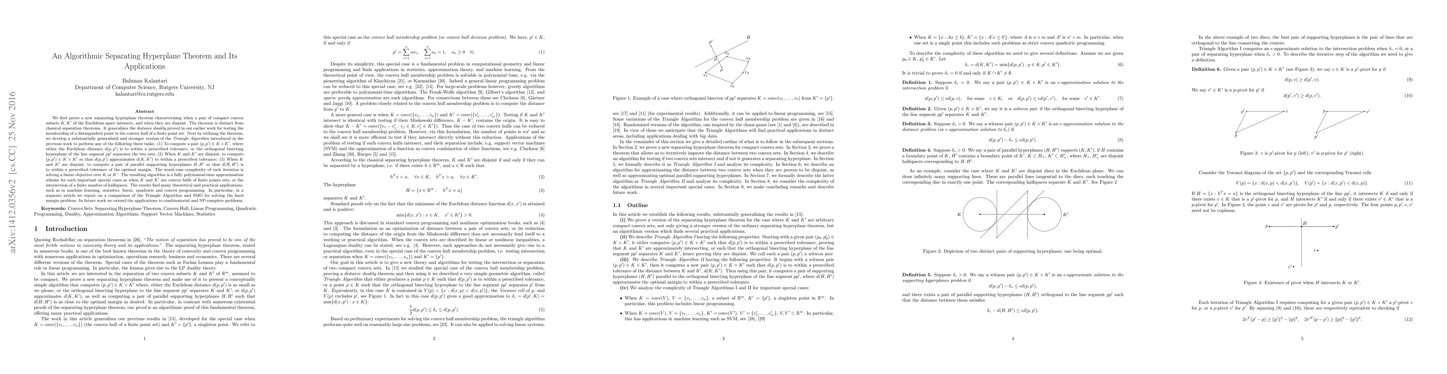 We first prove a new separating hyperplane theorem characterizing when a pair of compact convex subsets $K, K'$ of the Euclidean space intersect, and when they are disjoint. The theorem is distinct from classical separation theorems. It generalizes the {\it distance duality} proved in our earlier work for testing the membership of a distinguished point in the convex hull of a finite point set. Next by utilizing the theorem, we develop a substantially generalized and stronger version of the {\it Triangle Algorithm} introduced in the previous work to perform any of the following three tasks: (1) To compute a pair $(p,p') \in K \times K'$, where either the Euclidean distance $d(p,p')$ is to within a prescribed tolerance, or the orthogonal bisecting hyperplane of the line segment $pp'$ separates the two sets; (2) When $K$ and $K'$ are disjoint, to compute $(p,p') \in K \times K'$ so that $d(p,p')$ approximates $d(K,K')$ to within a prescribed tolerance; (3) When $K$ and $K'$ are disjoint, to compute a pair of parallel supporting hyperplanes $H,H'$ so that $d(H,H')$ is to within a prescribed tolerance of the optimal margin. The worst-case complexity of each iteration is solving a linear objective over $K$ or $K'$. The resulting algorithm is a fully polynomial-time approximation scheme for such important special cases as when $K$ and $K'$ are convex hulls of finite points sets, or the intersection of a finite number of halfspaces. The results find many theoretical and practical applications, such as in machine learning, statistics, linear, quadratic and convex programming. In particular, in a separate article we report on a comparison of the Triangle Algorithm and SMO for solving the hard margin problem. In future work we extend the applications to combinatorial and NP-complete problems.