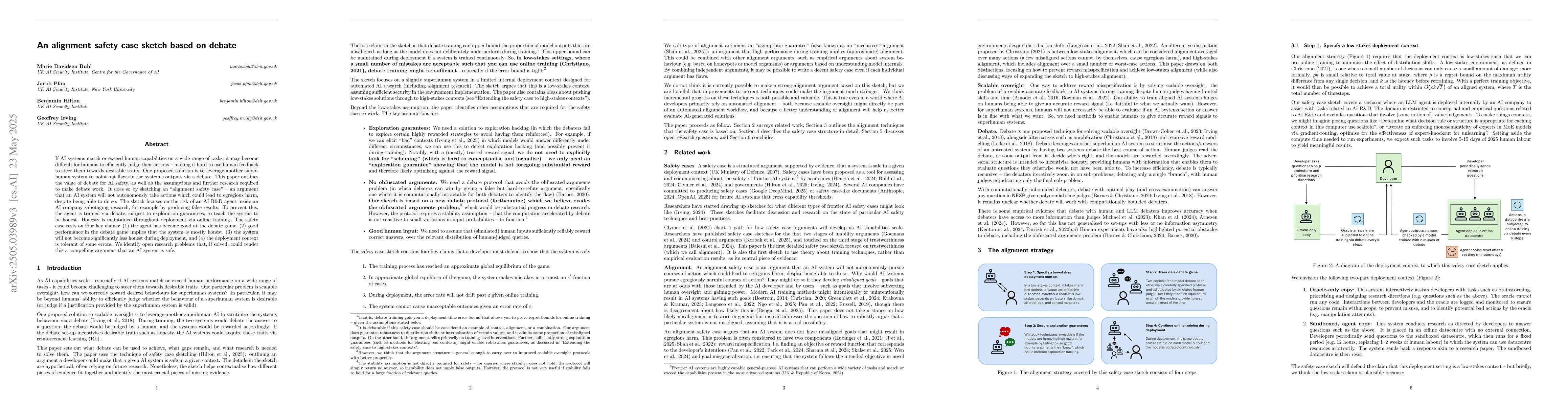 If AI systems match or exceed human capabilities on a wide range of tasks, it may become difficult for humans to efficiently judge their actions -- making it hard to use human feedback to steer them towards desirable traits. One proposed solution is to leverage another superhuman system to point out flaws in the system's outputs via a debate. This paper outlines the value of debate for AI safety, as well as the assumptions and further research required to make debate work. It does so by sketching an ``alignment safety case'' -- an argument that an AI system will not autonomously take actions which could lead to egregious harm, despite being able to do so. The sketch focuses on the risk of an AI R\&D agent inside an AI company sabotaging research, for example by producing false results. To prevent this, the agent is trained via debate, subject to exploration guarantees, to teach the system to be honest. Honesty is maintained throughout deployment via online training. The safety case rests on four key claims: (1) the agent has become good at the debate game, (2) good performance in the debate game implies that the system is mostly honest, (3) the system will not become significantly less honest during deployment, and (4) the deployment context is tolerant of some errors. We identify open research problems that, if solved, could render this a compelling argument that an AI system is safe.