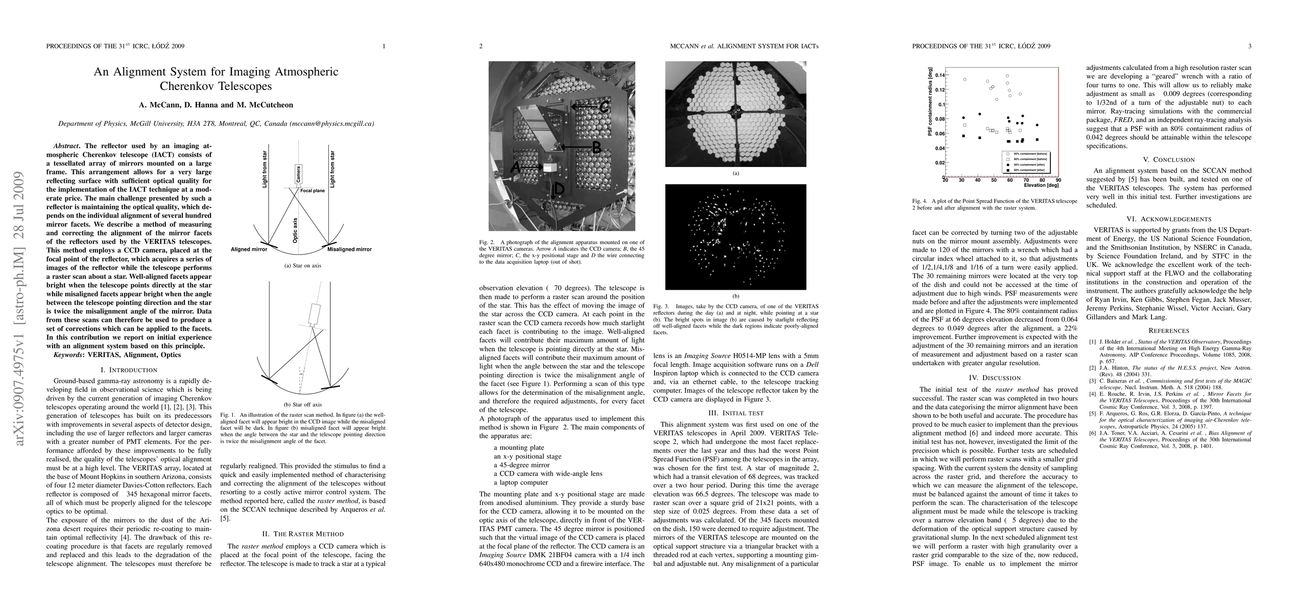 This paper presents an alignment system for imaging atmospheric Cherenkov telescopes (IACTs) that uses a CCD camera to measure and correct the alignment of hundreds of mirror facets. The method involves capturing images during a raster scan about a star, allowing for the identification and correction of misaligned facets to maintain optical quality.