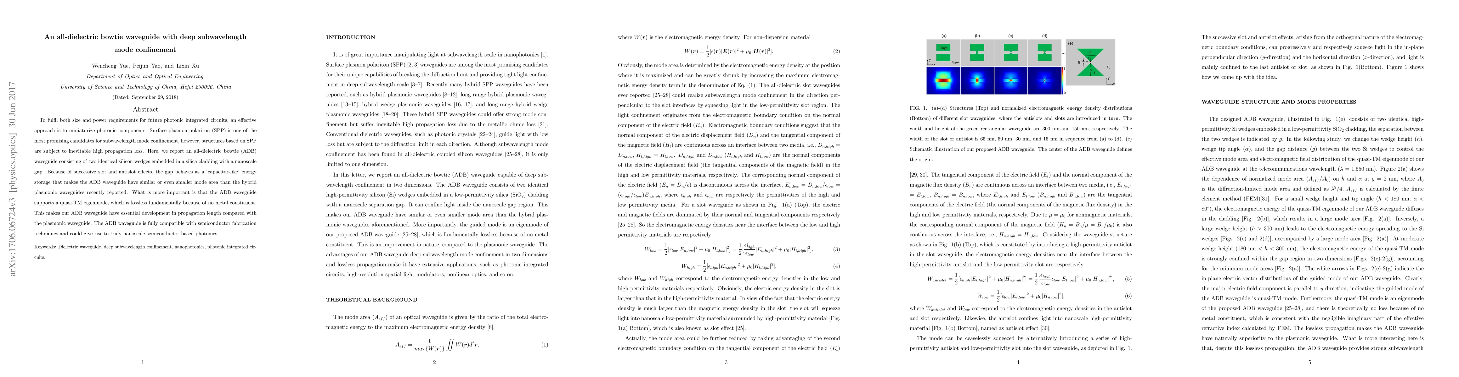 This paper introduces an all-dielectric bowtie (ADB) waveguide that achieves deep subwavelength mode confinement without the high propagation loss typical of plasmonic waveguides, offering a promising solution for future photonic integrated circuits. The ADB waveguide, composed of silicon wedges in a silica cladding, supports a lossless quasi-TM mode, enabling longer propagation lengths and compatibility with semiconductor fabrication.