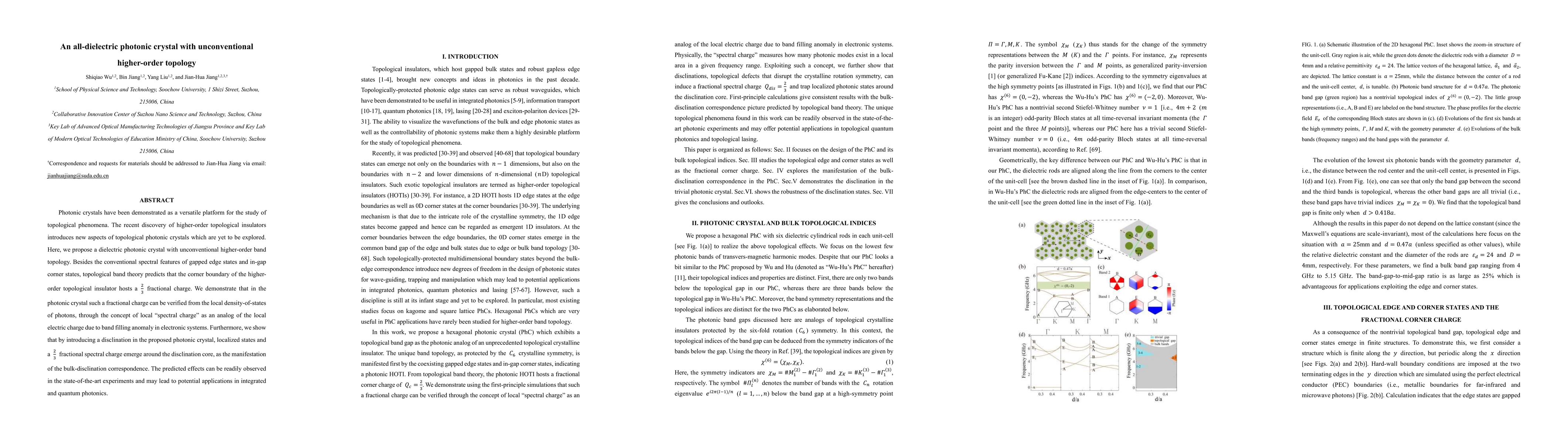 This paper proposes an all-dielectric photonic crystal with unconventional higher-order topological properties, demonstrating a 2/3 fractional charge at its corners and localized states around a disclination, which can be verified through local spectral charge analysis. These findings may have implications for integrated and quantum photonics.