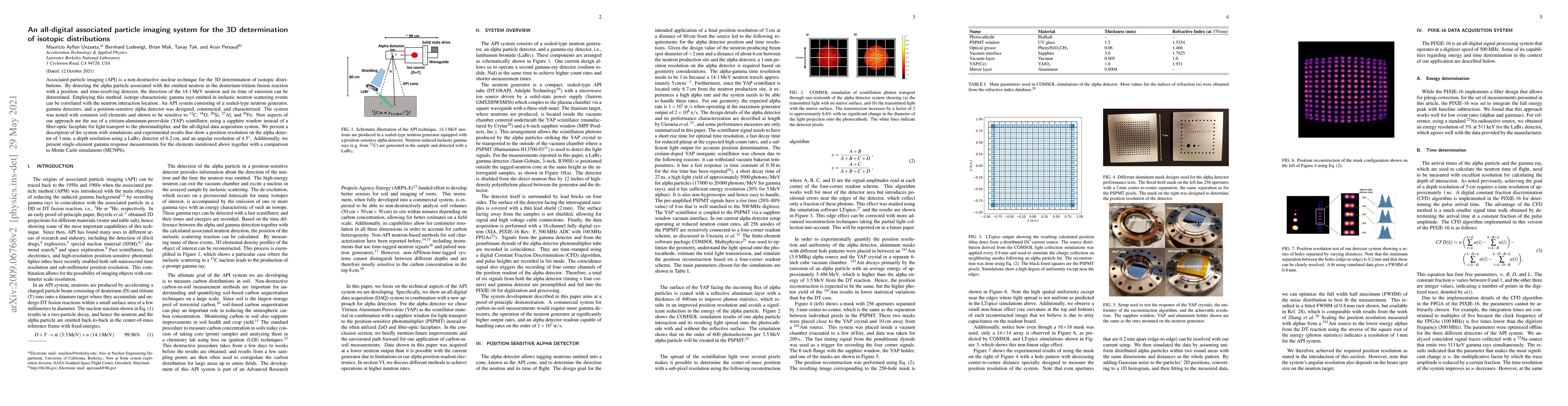 This paper describes an all-digital associated particle imaging system for 3D isotopic distribution determination using alpha particles from deuterium-tritium fusion reactions. The system, featuring a YAP scintillator and sapphire window, achieved 1 mm position resolution, 6.2 cm depth resolution, and 4.5 degrees angular resolution, validated through gamma response measurements and Monte Carlo simulations.