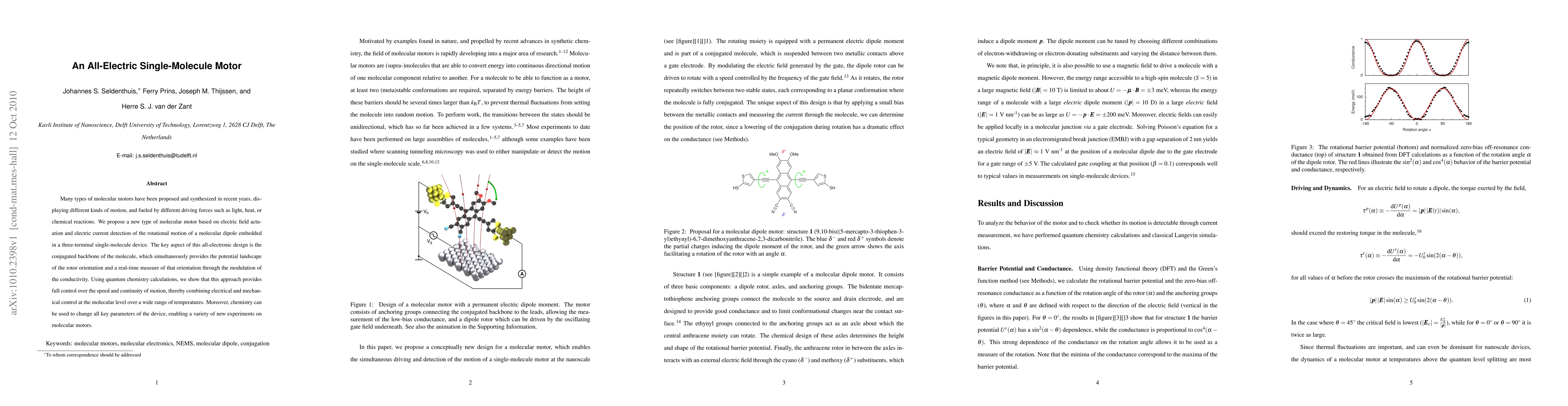 This research introduces an innovative all-electric single-molecule motor powered by an electric field, featuring a conjugated molecular backbone that controls and measures rotational motion through conductivity modulation. This design enables precise control over motor speed and continuity, offering a versatile platform for future molecular motor experiments.