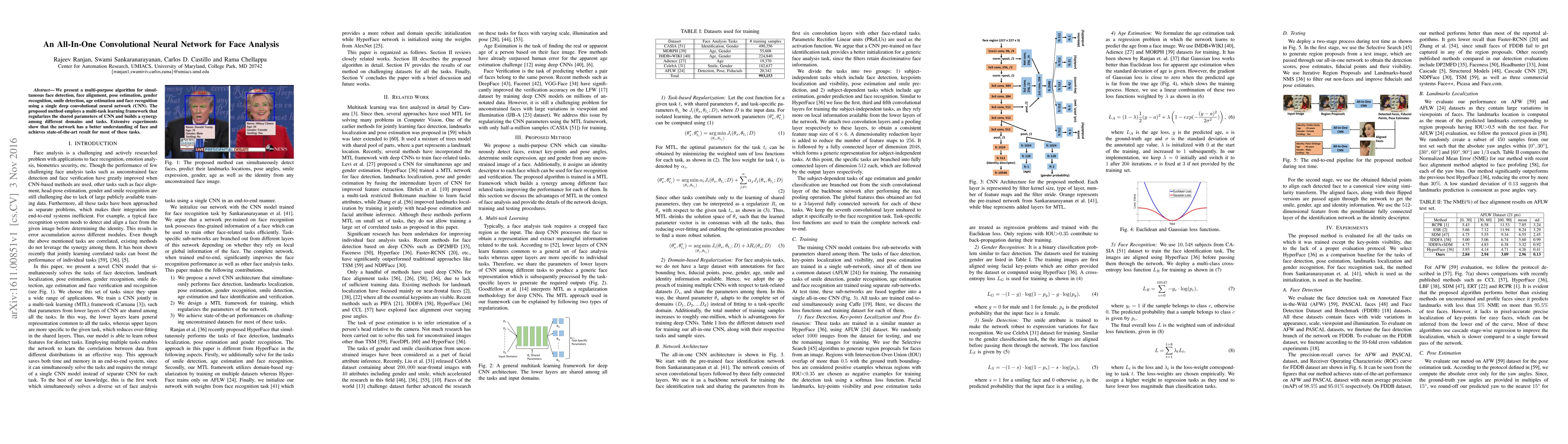 This paper introduces a single convolutional neural network (CNN) for multiple face analysis tasks, including detection, alignment, pose, gender, smile, age estimation, and recognition, using a multi-task learning framework. The method achieves state-of-the-art results for most tasks due to the synergy among different domains.