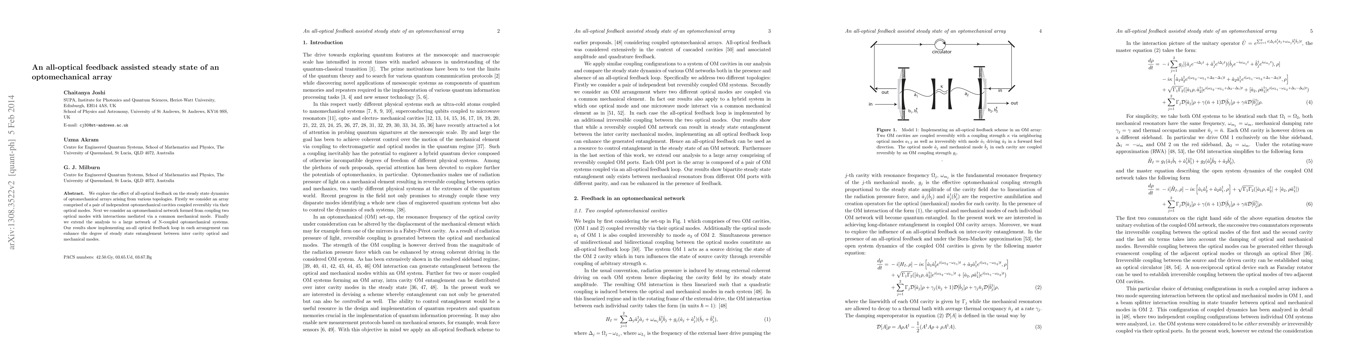 We explore the effect of all-optical feedback on the steady state dynamics of optomechanical arrays arising from various topologies. First we consider an array comprised of a pair of independent optomechanical cavities coupled reversibly via their optical modes. Next we consider an optomechanical network formed from coupling two optical modes with interactions mediated via a common mechanical mode. Finally we extend the analysis to a large network of N-coupled optomechanical systems. Our results show implementing an-all optical feedback loop in each arrangement can enhance the degree of steady state entanglement between inter cavity optical and mechanical modes.