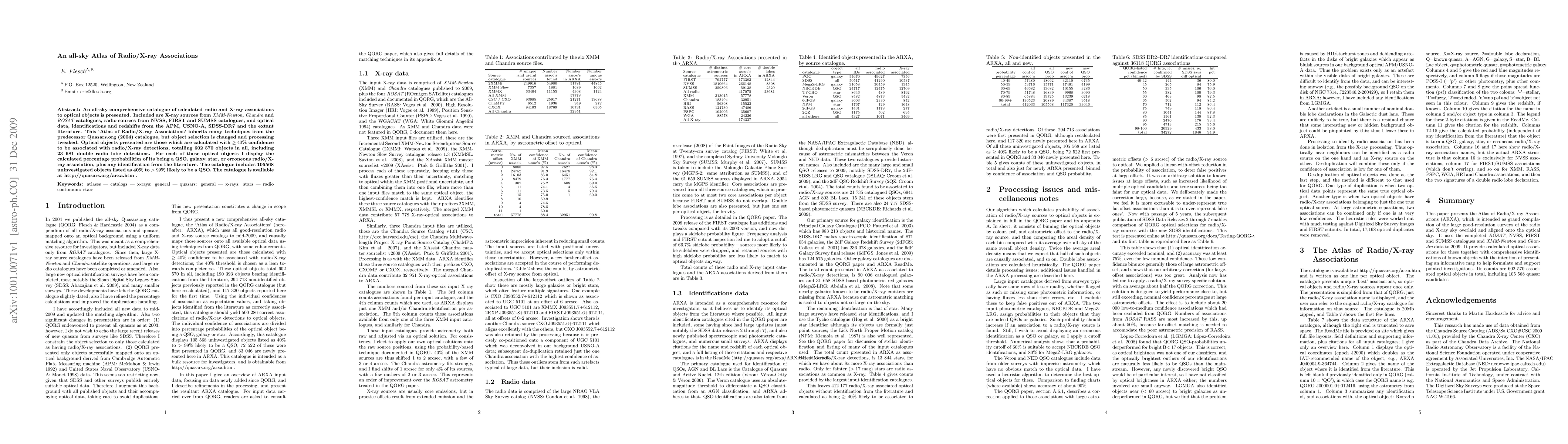 An all-sky comprehensive catalog of calculated radio and X-ray associations to optical objects is presented. Included are X-ray sources from XMM-Newton, Chandra and ROSAT catalogs, radio sources from NVSS, FIRST and SUMSS catalogs, and optical data, identifications and redshifts from the APM, USNO-A, SDSS-DR7 and the extant literature. This "Atlas of Radio/X-ray Associations" inherits many techniques from the predecessor Quasars.org (2004) catalog, but object selection is changed and processing tweaked. Optical objects presented are those which are calculated with >=40% confidence to be associated with radio/X-ray detections, totalling 602570 objects in all, including 23681 double radio lobe detections. For each of these optical objects I display the calculated percentage probabilities of its being a QSO, galaxy, star, or erroneous radio/X-ray association, plus any identification from the literature. The catalogue includes 105568 uninvestigated objects listed as 40% to >99% likely to be a QSO. The catalog is available at http://quasars.org/arxa.htm .