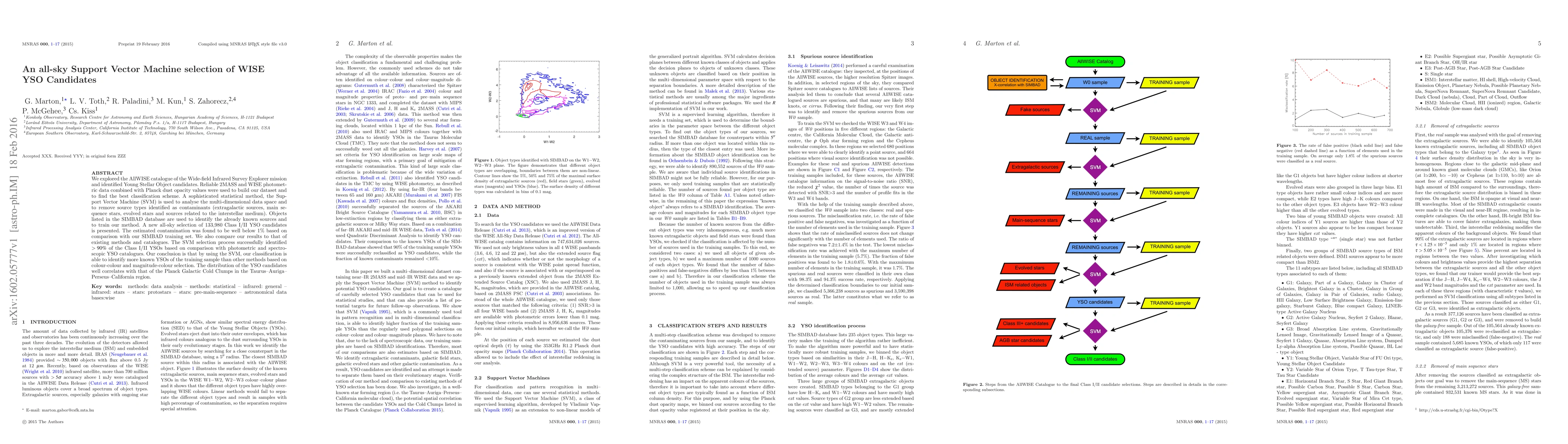 We explored the AllWISE catalogue of the Wide-field Infrared Survey Explorer mission and identified Young Stellar Object candidates. Reliable 2MASS and WISE photometric data combined with Planck dust opacity values were used to build our dataset and to find the best classification scheme. A sophisticated statistical method, the Support Vector Machine (SVM) is used to analyse the multi-dimensional data space and to remove source types identified as contaminants (extragalactic sources, main sequence stars, evolved stars and sources related to the interstellar medium). Objects listed in the SIMBAD database are used to identify the already known sources and to train our method. A new all-sky selection of 133,980 Class I/II YSO candidates is presented. The estimated contamination was found to be well below 1% based on comparison with our SIMBAD training set. We also compare our results to that of existing methods and catalogues. The SVM selection process successfully identified >90% of the Class I/II YSOs based on comparison with photometric and spectroscopic YSO catalogues. Our conclusion is that by using the SVM, our classification is able to identify more known YSOs of the training sample than other methods based on colour-colour and magnitude-colour selection. The distribution of the YSO candidates well correlates with that of the Planck Galactic Cold Clumps in the Taurus--Auriga--Perseus--California region.