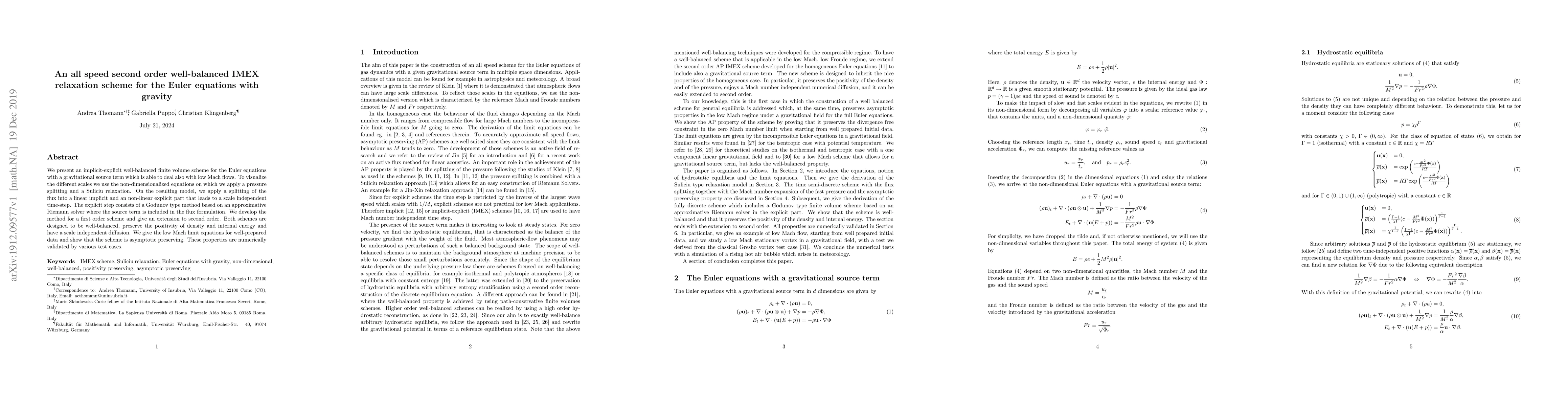 This paper introduces an implicit-explicit (IMEX) finite volume scheme for the Euler equations with gravity, designed to handle low Mach flows. The method employs a scale-independent time-step and maintains well-balanced properties, density positivity, and diffusion, validated through numerical test cases.