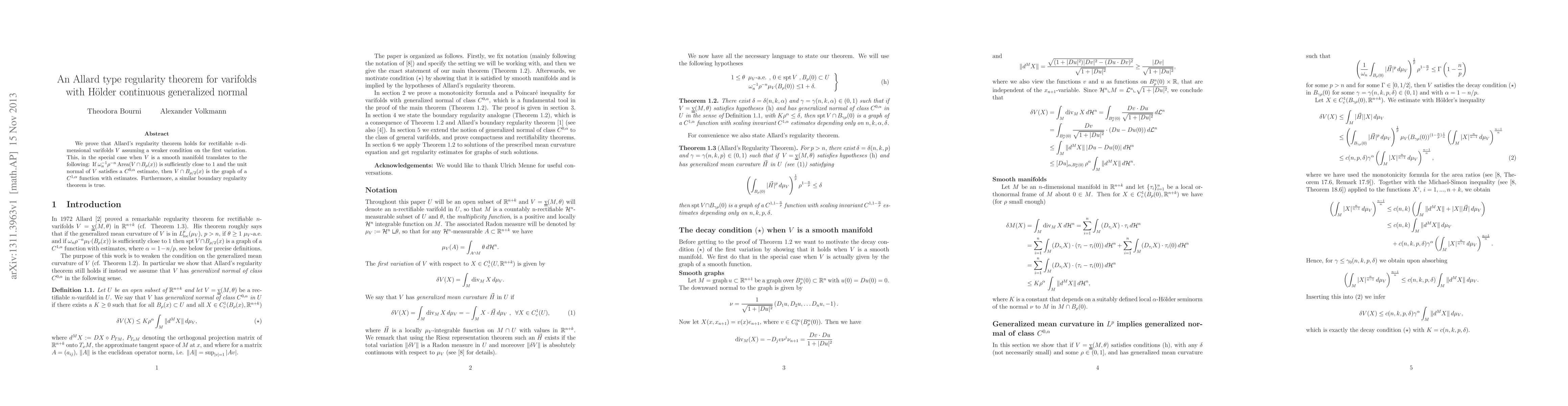 Researchers prove Allard's regularity theorem holds for rectifiable varifolds with a weaker condition on first variation, leading to improved boundary regularity theorems.