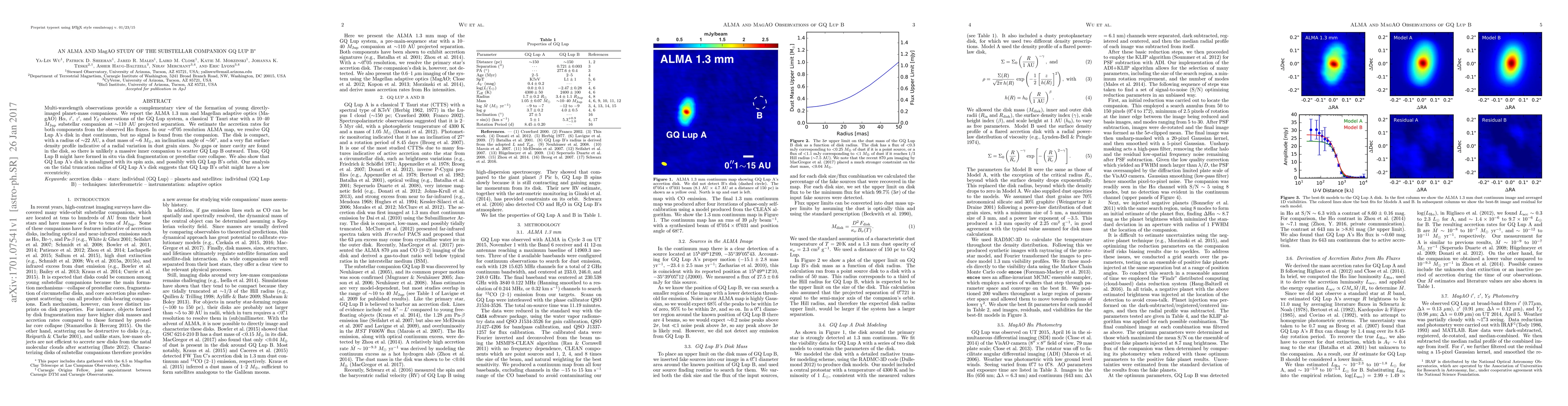 Multi-wavelength observations provide a complementary view of the formation of young directly-imaged planet-mass companions. We report the ALMA 1.3 mm and Magellan adaptive optics (MagAO) H-alpha, i', z', and Ys observations of the GQ Lup system, a classical T Tauri star with a 10-40 Mjup substellar companion at ~110 AU projected separation. We estimate the accretion rates for both components from the observed H-alpha fluxes. In our 0.05 arcsec resolution ALMA map, we resolve GQ Lup A's disk in dust continuum, but no signal is found from the companion. The disk is compact, with a radius of ~22 AU, a dust mass of ~6 Earth masses, an inclination angle of ~56 deg, and a very flat surface density profile indicative of a radial variation in dust grain sizes. No gaps or inner cavity are found in the disk, so there is unlikely a massive inner companion to scatter GQ Lup B outward. Thus, GQ Lup B might have formed in situ via disk fragmentation or prestellar core collapse. We also show that GQ Lup A's disk is misaligned with its spin axis, and possibly with GQ Lup B's orbit. Our analysis on the tidal truncation radius of GQ Lup A's disk suggests that GQ Lup B's orbit might have a low eccentricity.
