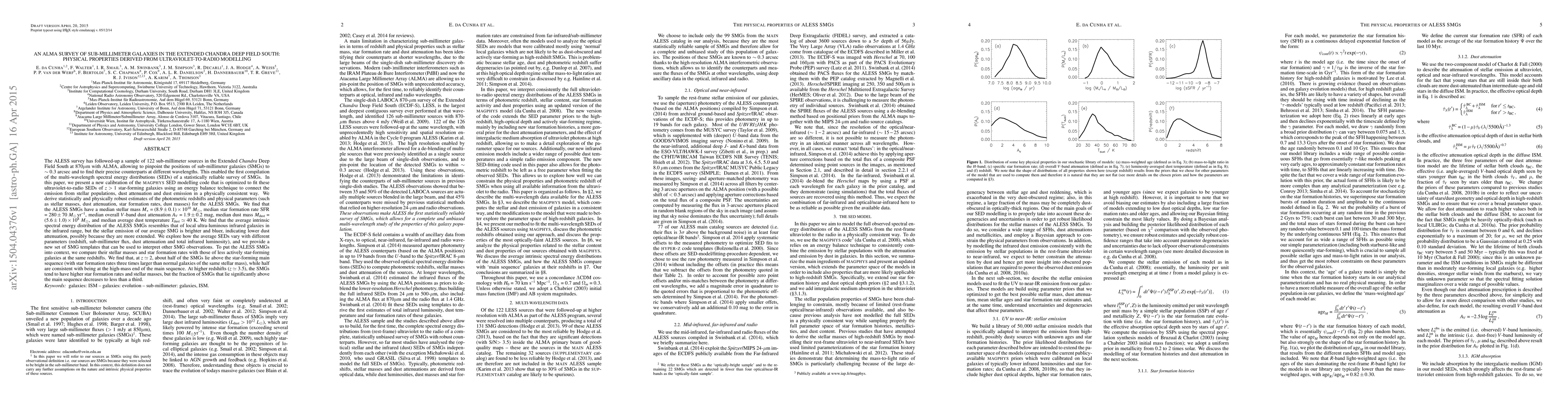 This paper uses ALMA to study 122 sub-millimeter galaxies (SMGs) in the Extended Chandra Deep Field South, deriving their physical properties through UV-to-radio modelling. The study finds SMGs have high stellar masses, star formation rates, and dust content, with median values indicating they are more extended and less dust-attenuated compared to local ultra-luminous infrared galaxies.