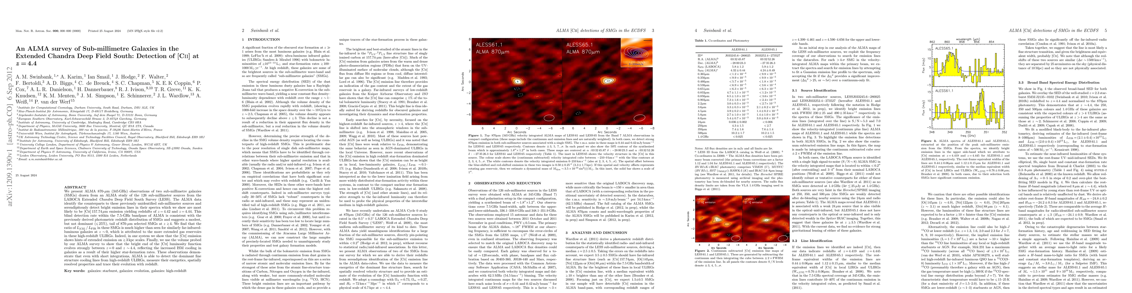 We present ALMA 870-um (345GHz) observations of two sub-millimetre galaxies (SMGs) drawn from an ALMA study of the 126 sub-millimeter sources from the LABOCA Extended Chandra Deep Field South Survey (LESS). The ALMA data identify the counterparts to these previously unidentified sub-millimeter sources and serendipitously detect bright emission lines in their spectra which we show are most likely to be [C II]157.74um emission yielding redshifts of z=4.42 and z=4.44. This blind detection rate within the 7.5-GHz bandpass of ALMA is consistent with the previously derived photometric redshift distribution of SMGs and suggests a modest, but not dominant (<25%), tail of 870-um selected SMGs at z>4. We find that the ratio of L_CII/L_FIR in these SMGs is much higher than seen for similarly far-infrared-luminous galaxies at z~0, which is attributed to the more extended gas reservoirs in these high-redshift ULIRGs. Indeed, in one system we show that the [C II] emission shows hints of extended emission on >3kpc scales. Finally, we use the volume probed by our ALMA survey to show that the bright end of the [C II] luminosity function evolves strongly between z=0 and z~4.4, reflecting the increased ISM cooling in galaxies as a result of their higher star-formation rates. These observations demonstrate that even with short integrations, ALMA is able to detect the dominant fine structure cooling lines from high-redshift ULIRGs, measure their energetics and trace their evolution with redshift.