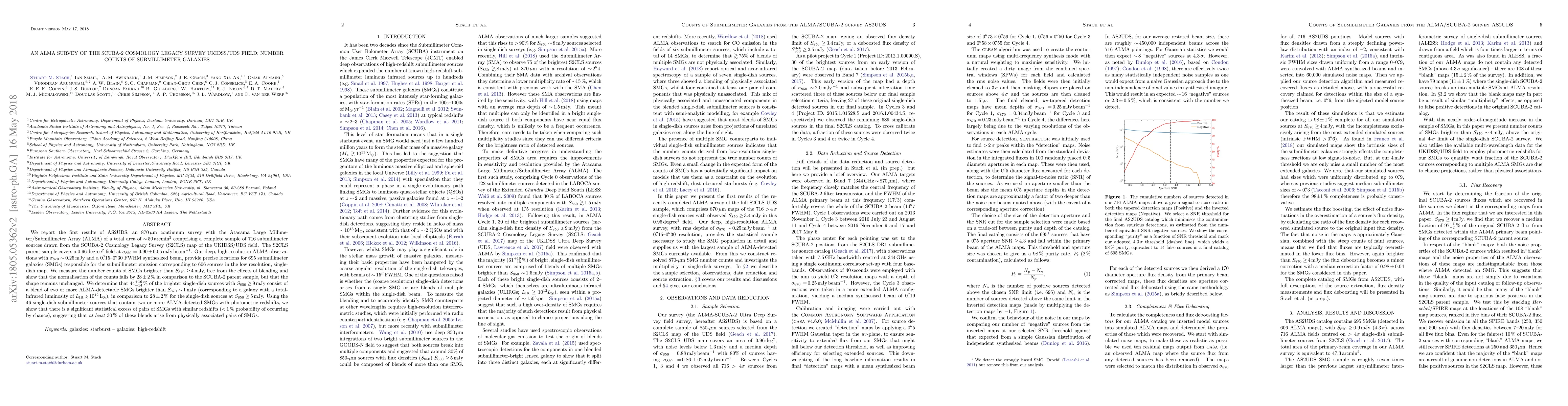 We report the first results of AS2UDS: an 870 $\mu$m continuum survey with the Atacama Large Millimeter/Submillimeter Array (ALMA) of a total area of $\sim$ 50 arcmin$^2$ comprising a complete sample of 716 submillimeter sources drawn from the SCUBA-2 Cosmology Legacy Survey (S2CLS) map of the UKIDSS/UDS field. The S2CLS parent sample covers a 0.96 degree$^2$ field at $\sigma_{850}=0.90\pm0.05$ mJy beam$^{-1}$. Our deep, high-resolution ALMA observations with $\sigma_{\rm 870}\sim$ 0.25 mJy and a 0.15"--0.30" FWHM synthesized beam, provide precise locations for 695 submillimetre galaxies (SMGs) responsible for the submillimeter emission corresponding to 606 sources in the low resolution, single-dish map. We measure the number counts of SMGs brighter than $S_{\rm 870}\geq$ 4 mJy, free from the effects of blending and show that the normalisation of the counts falls by 28 $\pm$ 2% in comparison to the SCUBA-2 parent sample, but that the shape remains unchanged. We determine that 44$^{+16}_{-14}$% of the brighter single-dish sources with $S_{850}\geq$ 9 mJy consist of a blend of two or more ALMA-detectable SMGs brighter than $S_{870}\sim$ 1 mJy (corresponding to a galaxy with a total-infrared luminosity of $L_{IR}\geq$ 10$^{12}$ L$_\odot$), in comparison to 28 $\pm$ 2% for the single-dish sources at $S_{\rm 850}\geq$ 5 mJy. Using the 46 single-dish submillimeter sources that contain two or more ALMA-detected SMGs with photometric redshifts, we show that there is a significant statistical excess of pairs of SMGs with similar redshifts ($<$1% probability of occurring by chance), suggesting that at least 30% of these blends arise from physically associated pairs of SMGs.