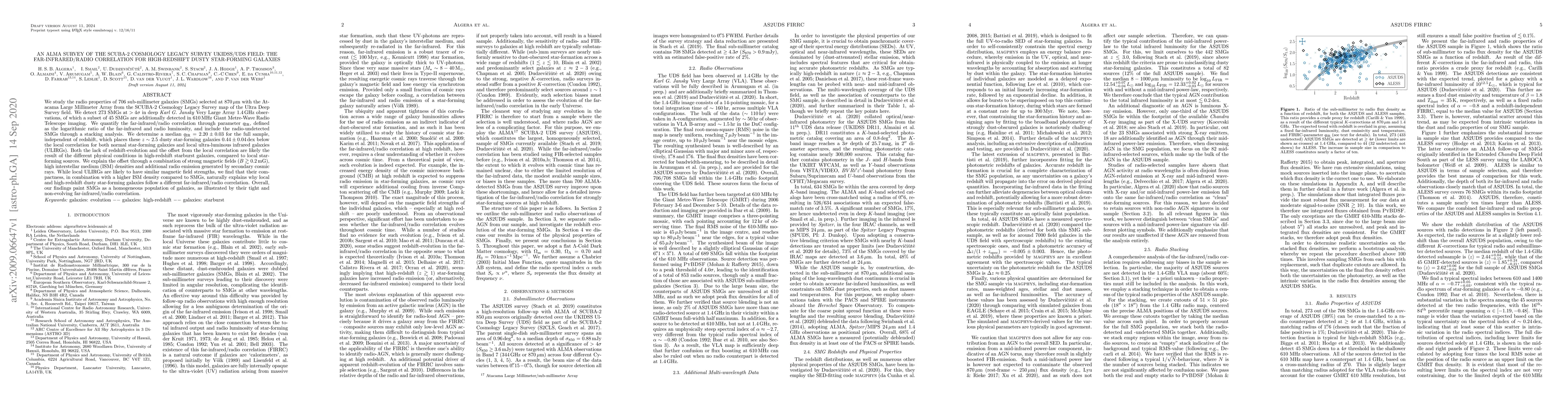 We study the radio properties of 706 sub-millimeter galaxies (SMGs) selected at 870$\mu$m with the Atacama Large Millimeter Array from the SCUBA-2 Cosmology Legacy Survey map of the Ultra Deep Survey field. We detect 273 SMGs at $>4\sigma$ in deep Karl G. Jansky Very Large Array 1.4 GHz observations, of which a subset of 45 SMGs are additionally detected in 610 MHz Giant Metre-Wave Radio Telescope imaging. We quantify the far-infrared/radio correlation through parameter $q_\text{IR}$, defined as the logarithmic ratio of the far-infrared and radio luminosity, and include the radio-undetected SMGs through a stacking analysis. We determine a median $q_\text{IR} = 2.20\pm0.03$ for the full sample, independent of redshift, which places these $z\sim2.5$ dusty star-forming galaxies $0.44\pm0.04$ dex below the local correlation for both normal star-forming galaxies and local ultra-luminous infrared galaxies (ULIRGs). Both the lack of redshift-evolution and the offset from the local correlation are likely the result of the different physical conditions in high-redshift starburst galaxies, compared to local star-forming sources. We explain the offset through a combination of strong magnetic fields ($B\gtrsim0.2$mG), high interstellar medium (ISM) densities and additional radio emission generated by secondary cosmic rays. While local ULIRGs are likely to have similar magnetic field strengths, we find that their compactness, in combination with a higher ISM density compared to SMGs, naturally explains why local and high-redshift dusty star-forming galaxies follow a different far-infrared/radio correlation. Overall, our findings paint SMGs as a homogeneous population of galaxies, as illustrated by their tight and non-evolving far-infrared/radio correlation.