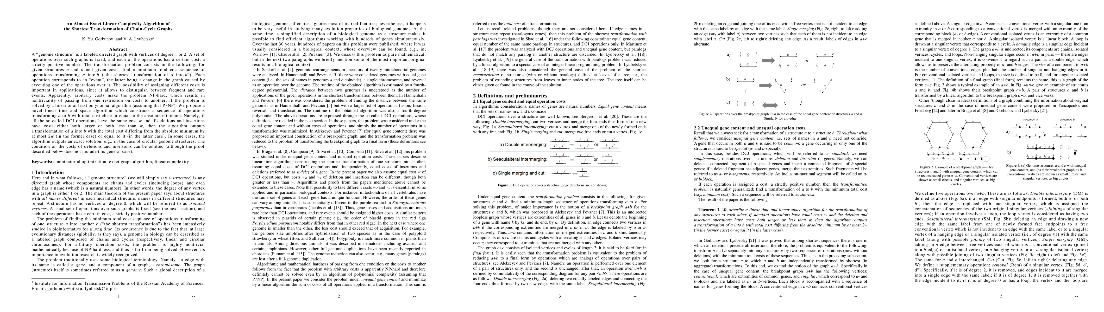 A "genome structure" is a labeled directed graph with vertices of degree 1 or 2. A set of operations over such graphs is fixed, and each of the operations has a certain cost, a strictly positive number. The transformation problem consists in the following: for given structures a and b and given costs, find a minimum total cost sequence of operations transforming a into b ("the shortest transformation of a into b"). Each operation corresponds to an "event", the latter being a change in the graph caused by executing one of the operations over it. The possibility of assigning different costs is important in applications, since it allows to distinguish between frequent and rare events. Apparently, arbitrary costs make the problem NP-hard, which results in nontriviality of passing from one restriction on costs to another, if the problem is solved by a linear or at least polynomial algorithm (assuming that P is not equal NP). We propose a novel linear time and space algorithm which constructs a sequence of operations transforming a to b with total cost close or equal to the absolute minimum. Namely, if all the so-called DCJ operations have the same cost w and if deletions and insertions have costs either both larger or both less than w, then the algorithm outputs a transformation of a into b with the total cost differing from the absolute minimum by at most 2w (in the former case) or equal to it (in the latter case). In some cases, the algorithm outputs an exact solution, e.g., in the case of circular genome structures. The condition on the costs of deletions and insertions can be omitted (although the proof described below does not include this general case).