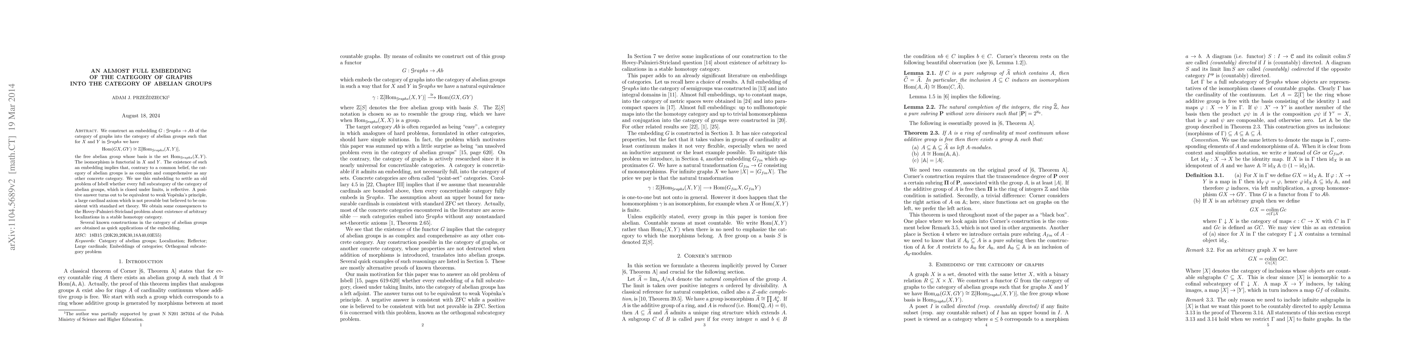 Summary: This paper constructs an almost full embedding of the category of graphs into the category of abelian groups, revealing the complexity of abelian groups and settling an old problem on reflective subcategories. It also connects the embedding to weak Vopenka's principle and provides consequences for the Hovey-Palmieri-Strickland problem on localizations.