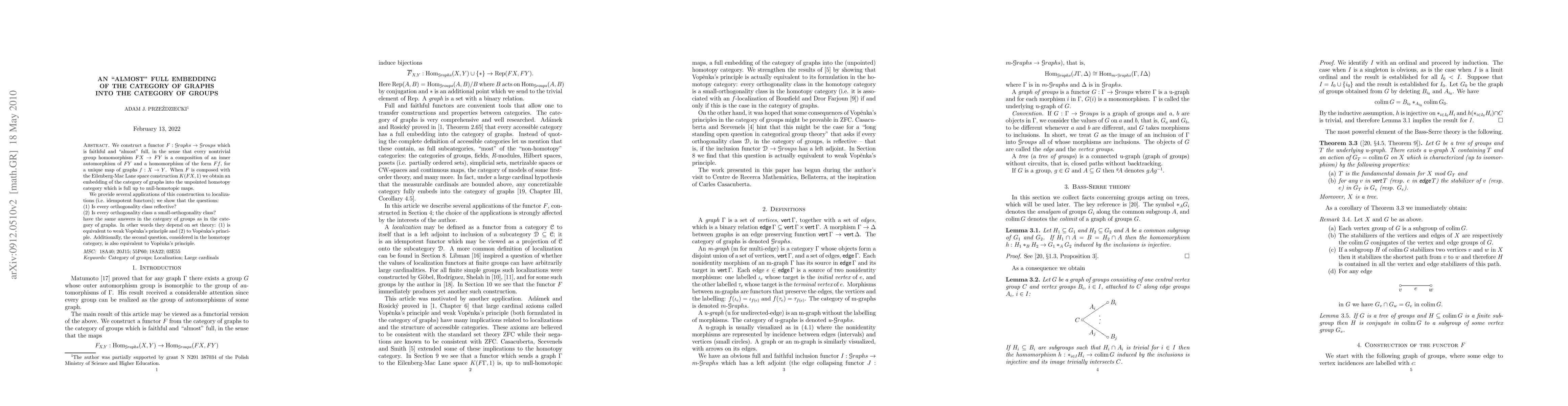 Summary: This paper presents a functor embedding the category of graphs into the category of groups that is faithful and nearly full, preserving Hom set bijections except for trivial homomorphisms and conjugation, with applications to localizations in group and homotopy categories.