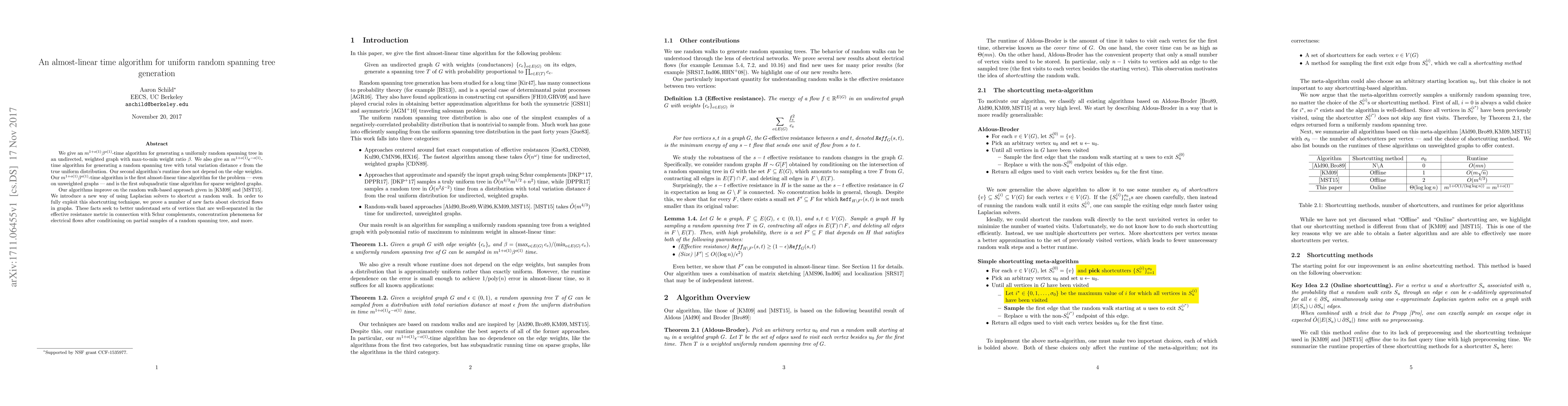 Researchers have developed two algorithms to generate a uniformly random spanning tree in an undirected weighted graph: one with almost-linear time complexity and another with subquadratic time complexity that doesn't depend on edge weights.