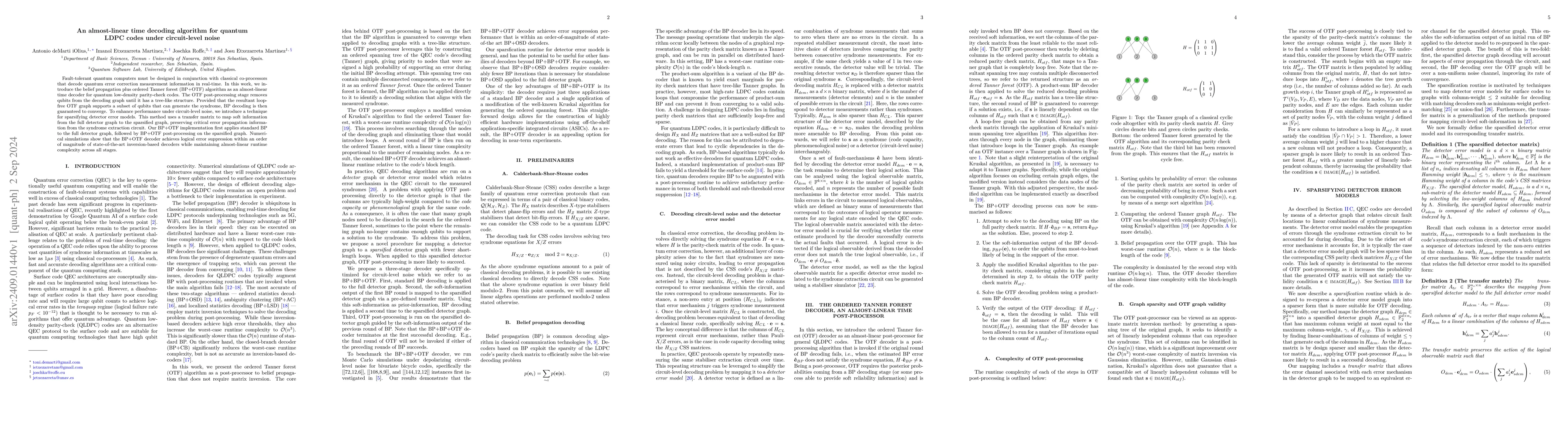 Fault-tolerant quantum computers must be designed in conjunction with classical co-processors that decode quantum error correction measurement information in real-time. In this work, we introduce the belief propagation plus ordered Tanner forest (BP+OTF) algorithm as an almost-linear time decoder for quantum low-density parity-check codes. The OTF post-processing stage removes qubits from the decoding graph until it has a tree-like structure. Provided that the resultant loop-free OTF graph supports a subset of qubits that can generate the syndrome, BP decoding is then guaranteed to converge. To enhance performance under circuit-level noise, we introduce a technique for sparsifying detector error models. This method uses a transfer matrix to map soft information from the full detector graph to the sparsified graph, preserving critical error propagation information from the syndrome extraction circuit. Our BP+OTF implementation first applies standard BP to the full detector graph, followed by BP+OTF post-processing on the sparsified graph. Numerical simulations show that the BP+OTF decoder achieves similar logical error suppression compared to state-of-the-art inversion-based and matching decoders for bivariate bicycle and surface codes, respectively, while maintaining almost-linear runtime complexity across all stages.