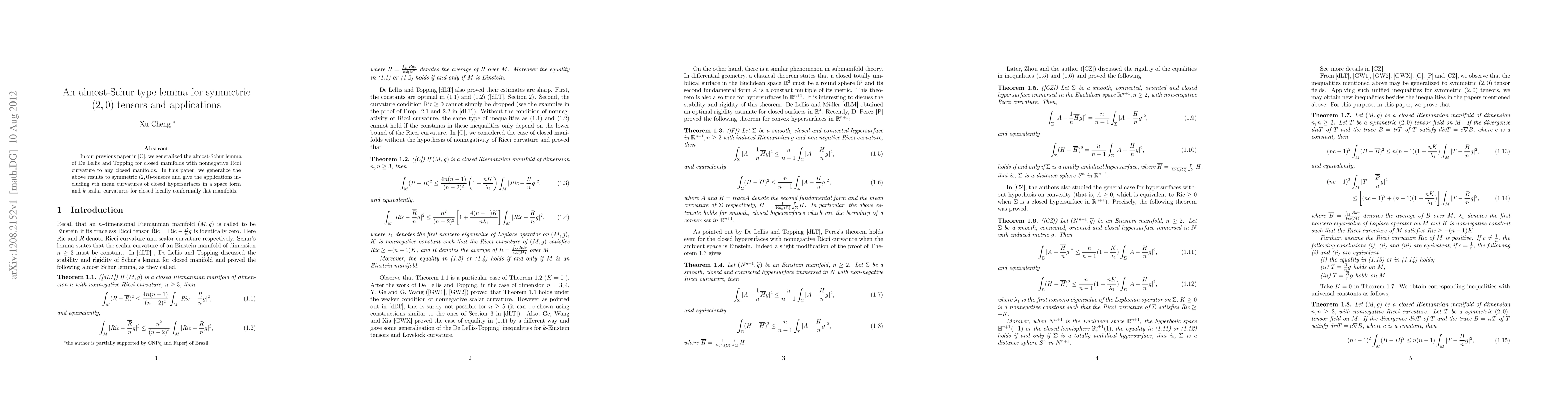 **Summary:** This paper extends an almost-Schur lemma to symmetric $(2,0)$ tensors, with applications to $r$th mean curvatures of closed hypersurfaces and $k$ scalar curvatures in closed locally conformally flat manifolds. It builds on previous work generalizing similar results for closed manifolds with nonnegative RCCI curvature.