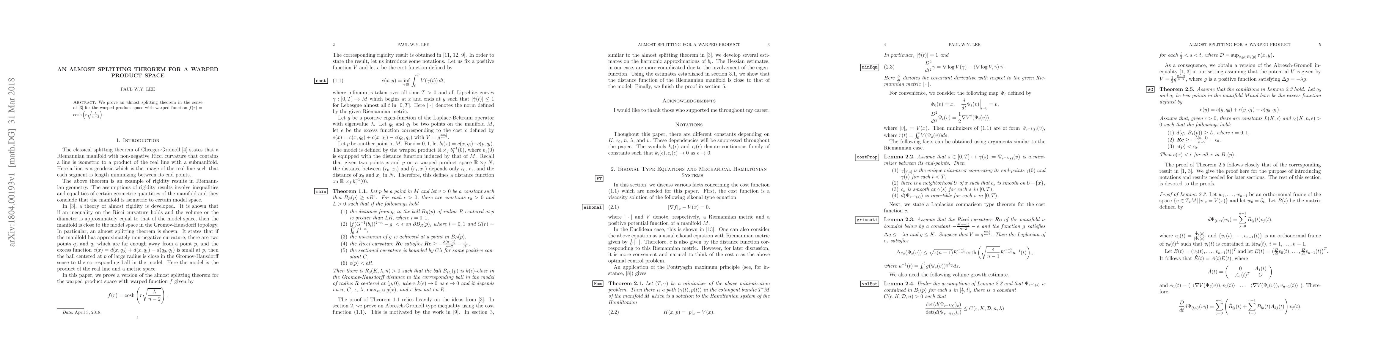The paper presents a detailed proof of an almost splitting theorem for warped product spaces, utilizing harmonic approximations and distance estimates, contributing novel techniques in geometric analysis.
