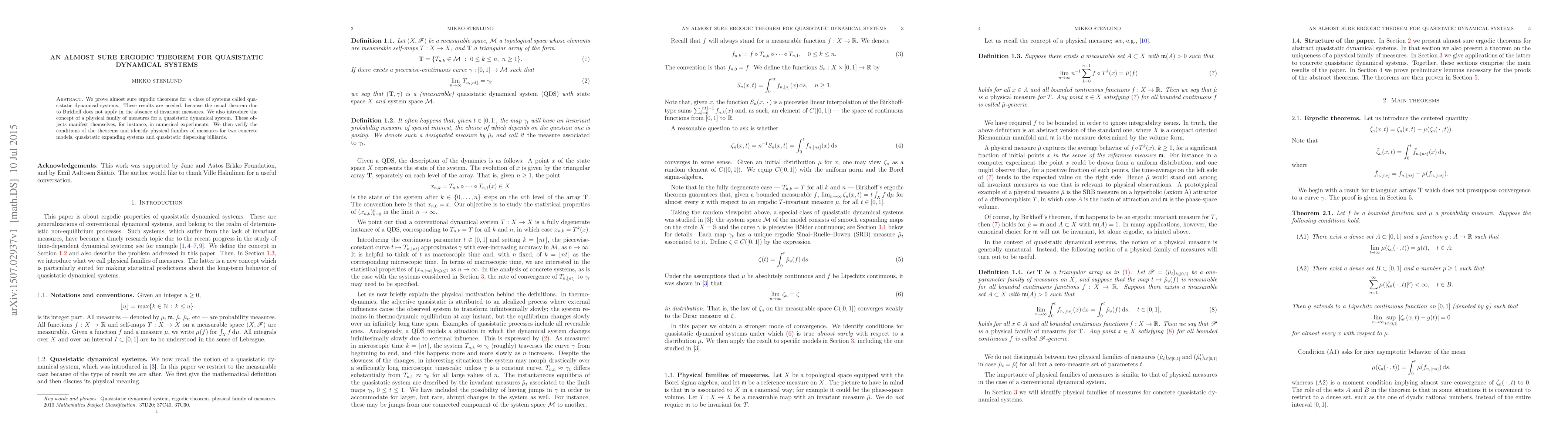 We prove almost sure ergodic theorems for a class of systems called quasistatic dynamical systems. These results are needed, because the usual theorem due to Birkhoff does not apply in the absence of invariant measures. We also introduce the concept of a physical family of measures for a quasistatic dynamical system. These objects manifest themselves, for instance, in numerical experiments. We then verify the conditions of the theorems and identify physical families of measures for two concrete models, quasistatic expanding systems and quasistatic dispersing billiards.