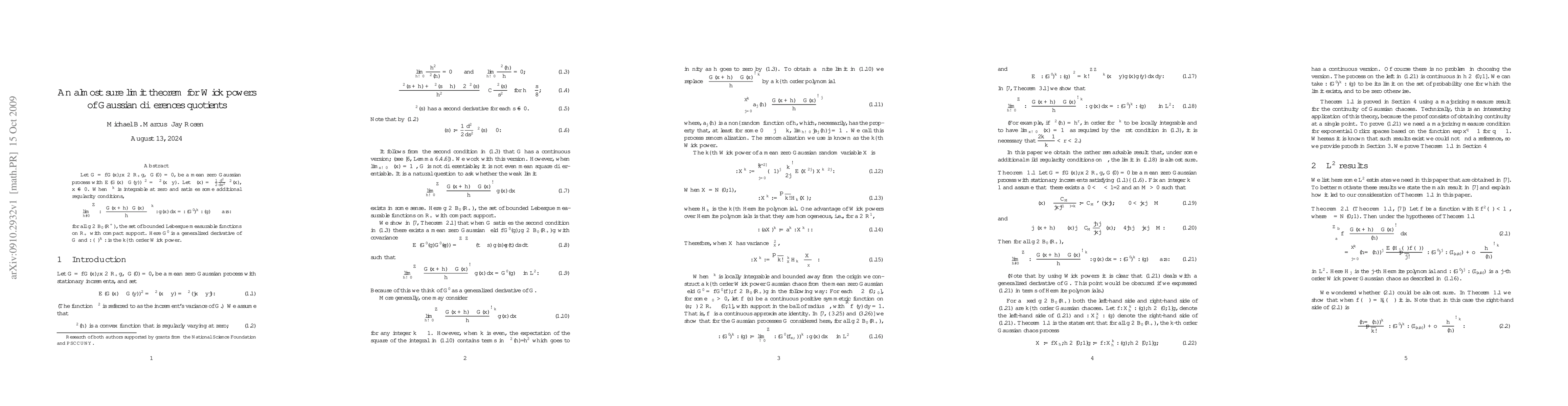 Let G={G(x), x\in R_+}, G(0)=0, be a mean zero Gaussian process with $E(G(x)-G(y))^2=\sigma ^2(x-y) $. Let $ \rho (x)= \frac12{d^{2}\over dx^2}\sigma^2(x)$, $x\ne 0 $. When $\rho^{k}$ is integrable at zero and satisfies some additional regularity conditions, \[ \lim_{h\downarrow 0} \int :(\frac{G(x+h)-G(x)}{h})^{k}:g(x) dx=:(G') ^{k}:(g){.3 in}a.s. \] for all $g\in B_{0}(R^{+})$, the set of bounded Lebesgue measurable functions on $R_+$ with compact support. Here $G'$ is a generalized derivative of $G$ and $:(\cd)^{k}:$ is the $k$--th order Wick power.