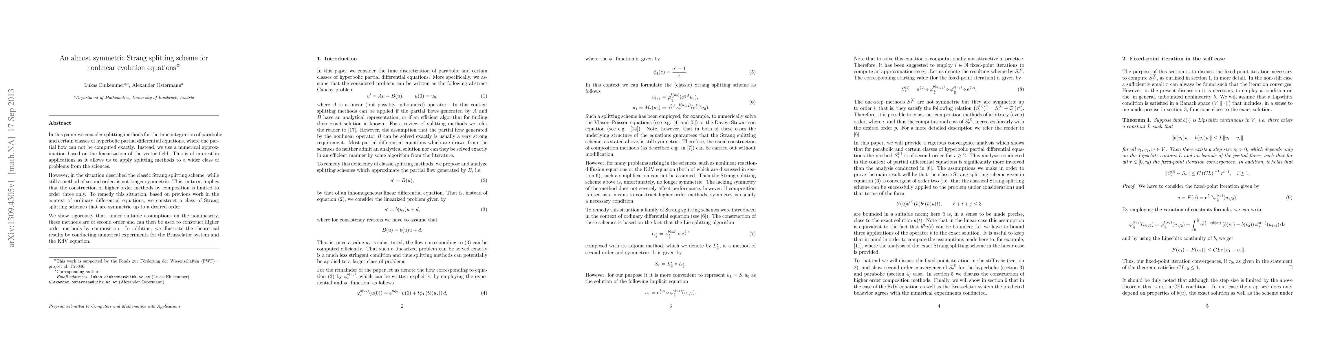 This paper develops a symmetric Strang splitting scheme for solving nonlinear evolution equations, where exact solutions are infeasible. The proposed method maintains second-order accuracy and allows for higher-order extensions, demonstrated through numerical experiments for the Brusselator system and the KdV equation.