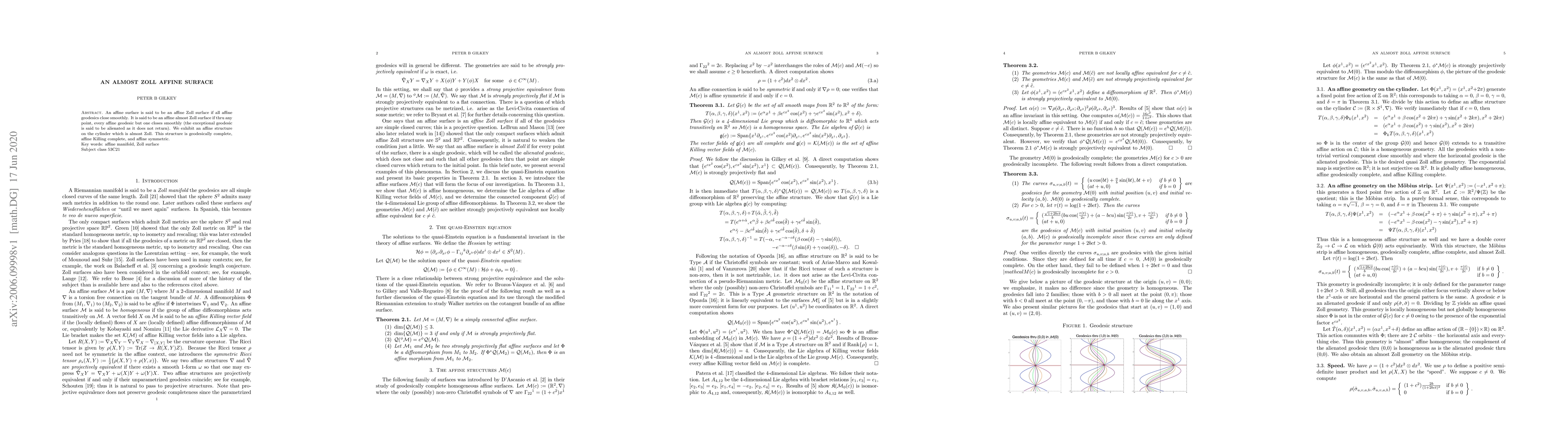 This paper introduces an affine structure on the cylinder that qualifies as an affine almost Zoll surface, where all affine geodesics close smoothly except for one exceptional geodesic. The structure is shown to be geodesically complete, affine Killing complete, and affine symmetric.