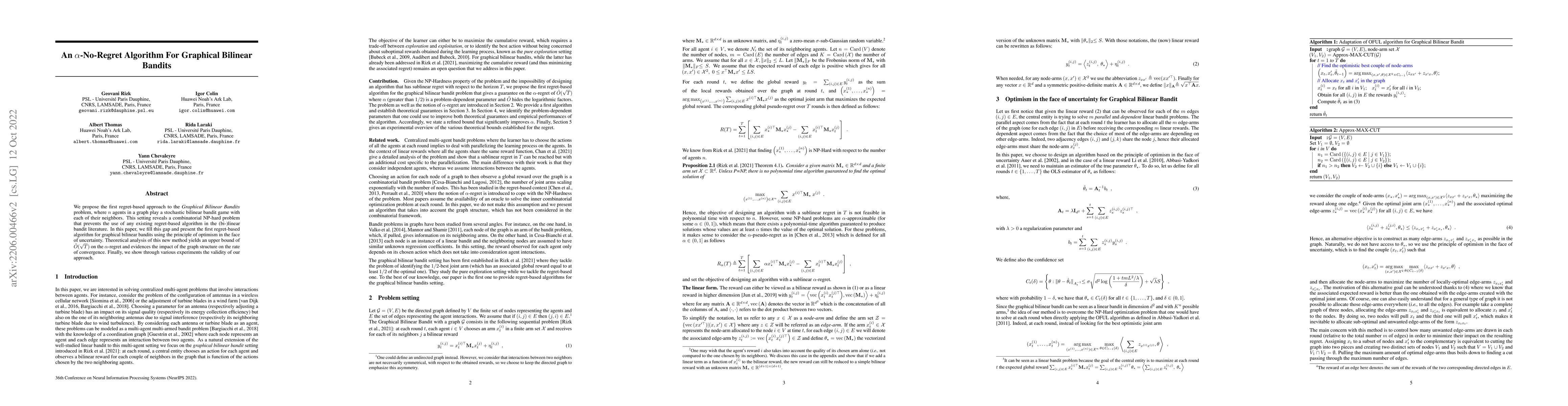 This paper introduces the first regret-based algorithm for the Graphical Bilinear Bandits problem, addressing a combinatorial NP-hard issue that precludes existing linear bandit methods. The proposed $\alpha$-no-regret algorithm leverages optimism to achieve an $\tilde{O}(\sqrt{T})$ upper bound on $\alpha$-regret, demonstrating the influence of graph structure on convergence rates.