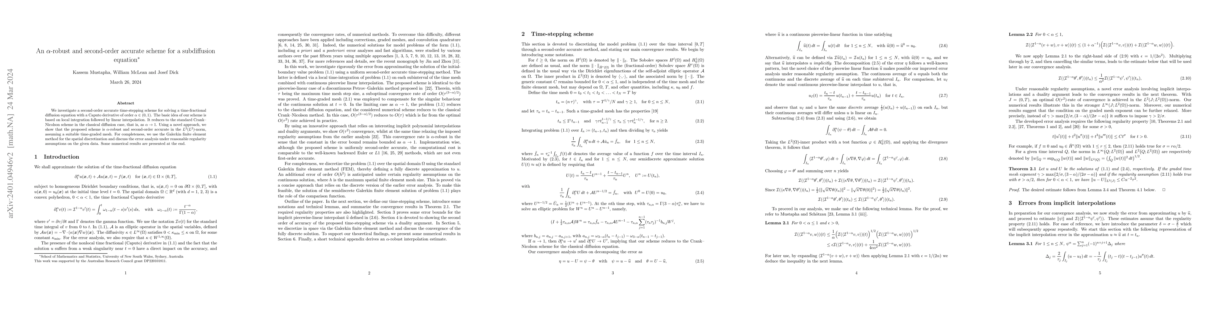We investigate a second-order accurate time-stepping scheme for solving a time-fractional diffusion equation with a Caputo derivative of order~$\alpha \in (0,1)$. The basic idea of our scheme is based on local integration followed by linear interpolation. It reduces to the standard Crank--Nicolson scheme in the classical diffusion case, that is, as $\alpha\to 1$. Using a novel approach, we show that the proposed scheme is $\alpha$-robust and second-order accurate in the $L^2(L^2)$-norm, assuming a suitable time-graded mesh. For completeness, we use the Galerkin finite element method for the spatial discretization and discuss the error analysis under reasonable regularity assumptions on the given data. Some numerical results are presented at the end.
