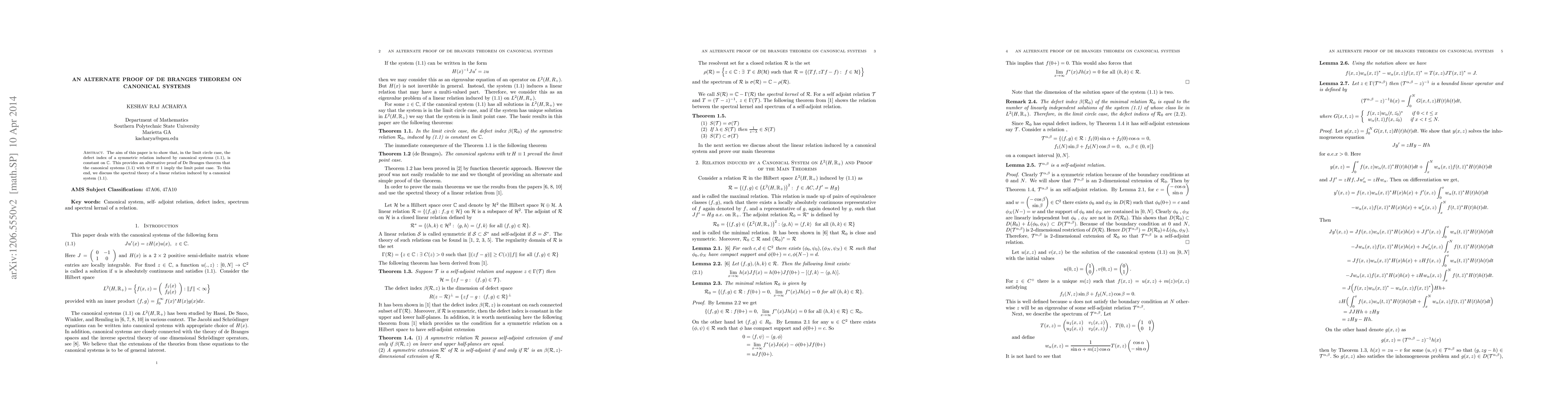This paper presents an alternative proof of the De Branges theorem by demonstrating that the defect index of a symmetric relation induced by canonical systems is constant in the limit circle case, thereby confirming the implication of canonical systems with tr H(x)=1 on the limit point case. The proof leverages spectral theory of linear relations derived from canonical systems.