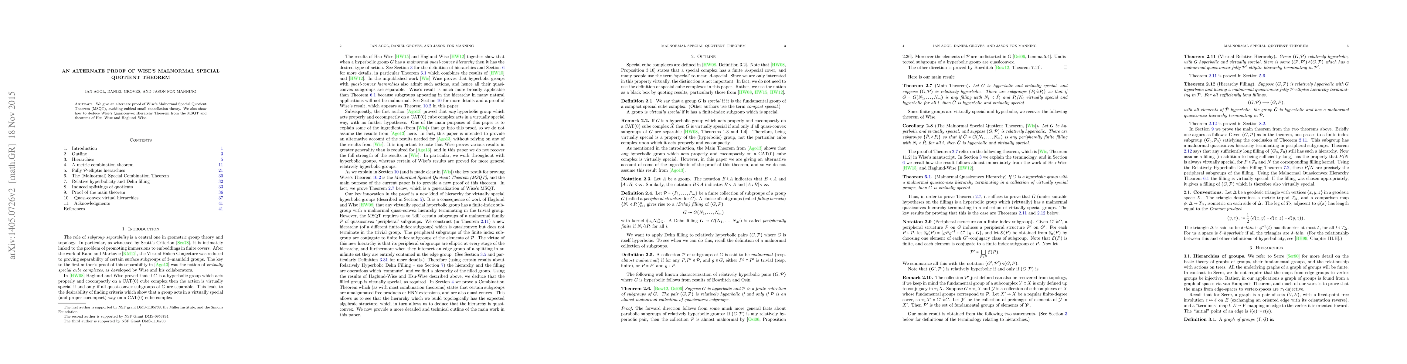 Researchers provide an alternative proof of Wise's Malnormal Special Quotient Theorem, linking it to other theorems in the field and demonstrating its implications.