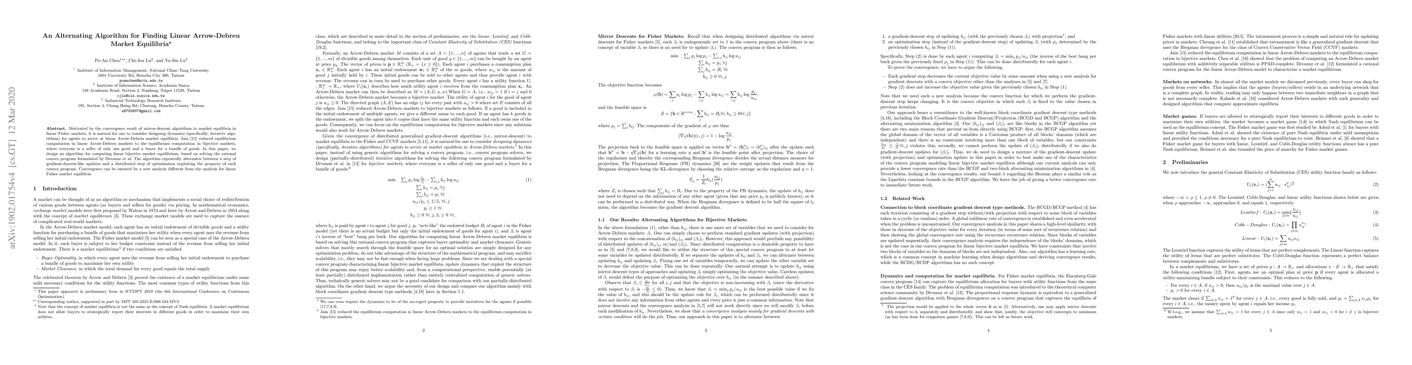 This paper proposes an alternating algorithm for finding linear Arrow-Debreu market equilibria by reducing the problem to computing equilibria in bijective markets. The algorithm alternates between gradient-descent-like updates and distributed optimization steps, ensuring convergence through a novel analysis.