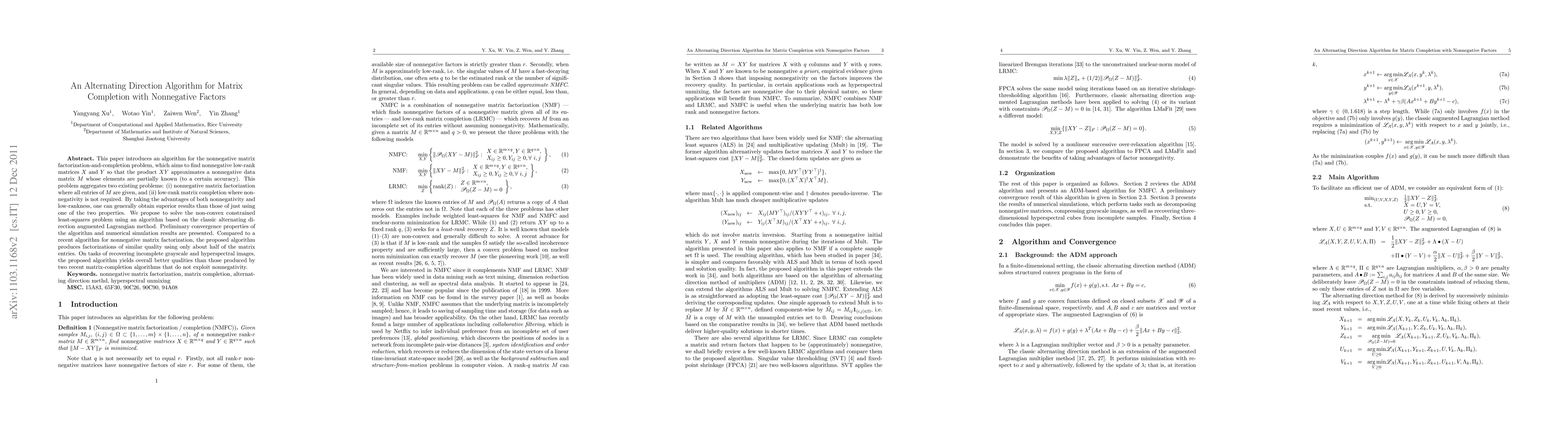 This paper proposes an alternating direction algorithm for solving the nonnegative matrix factorization-and-completion problem, achieving superior results by leveraging both nonnegativity and low-rank constraints. The algorithm outperforms recent methods in terms of efficiency and quality of recovered incomplete matrices.