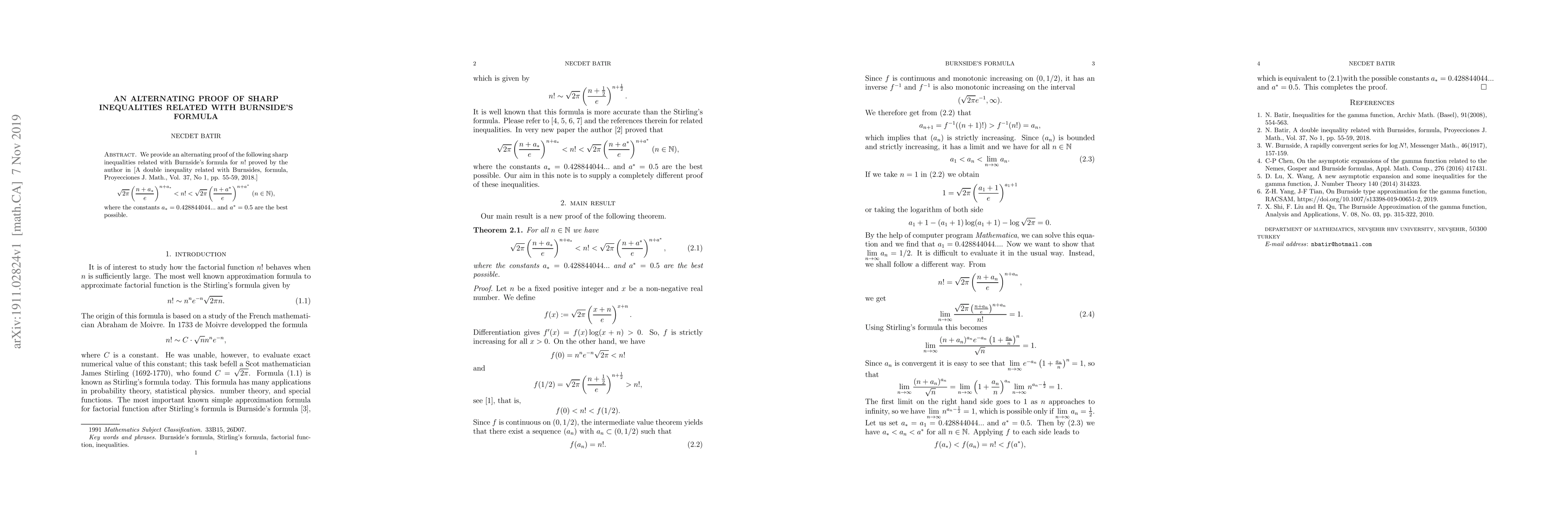 We provide an alternating proof of sharp inequalities related with Burnside's formula for $n!$