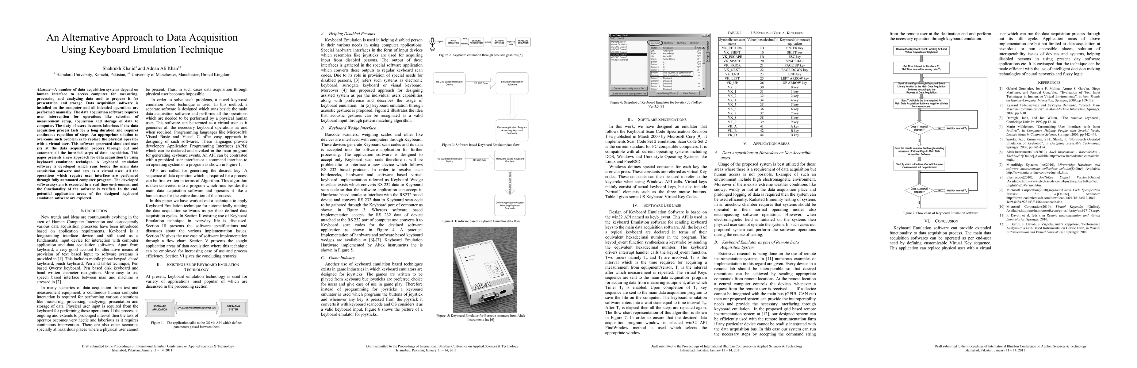 A number of data acquisition systems depend on human interface to access computer for measuring, processing and analyzing data and to prepare it for presentation and storage. Data acquisition software is installed on the computer and all intended operations are performed manually. The data acquisition software requires user intervention for operations like selection of measurement setup, acquisition and storage of data to computer. The duty of users becomes laborious if the data acquisition process lasts for a long duration and requires continuous repetition of steps. An appropriate solution to overcome such problem is to replace the physical operator with a virtual user. This software generated simulated user sits at the data acquisition process through out and automate all the intended steps of data acquisition. This paper presents a new approach for data acquisition by using keyboard emulation technique. A keyboard emulation software is developed which runs beside the main data acquisition software and acts as a virtual user. All the operations which require user interface are performed through fully automated computer program. The developed software/system is executed in a real time environment and the functionality of the software is verified. In the end, potential application areas of the designed keyboard emulation software are explored.