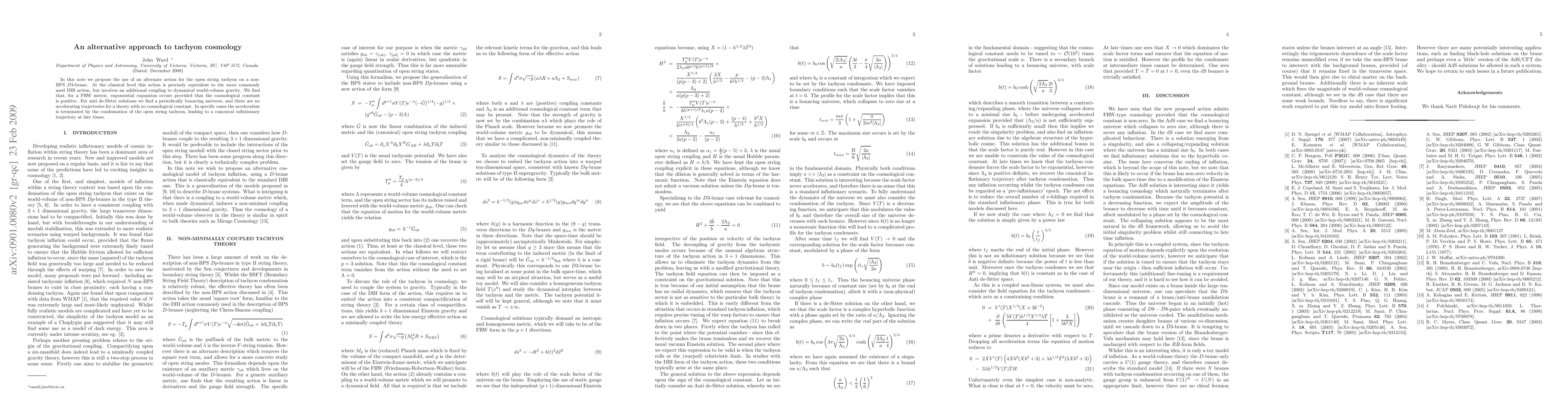 In this note we propose the use of an alternate action for the open string tachyon on a non-BPS $D3$-brane. At the classical level this action is precisely equivalent to the more commonly used DBI action, but involves an additional coupling to dynamical world-volume gravity. We find that, for a FRW metric, exponential expansion occurs provided that the cosmological constant is positive. For anti de-Sitter solutions we find a periodically bouncing universe, and there are no accelerating trajectories for a theory with no cosmological constant. In specific cases the acceleration is terminated by the condensation of the open string tachyon, leading to a canonical inflationary trajectory at late times.