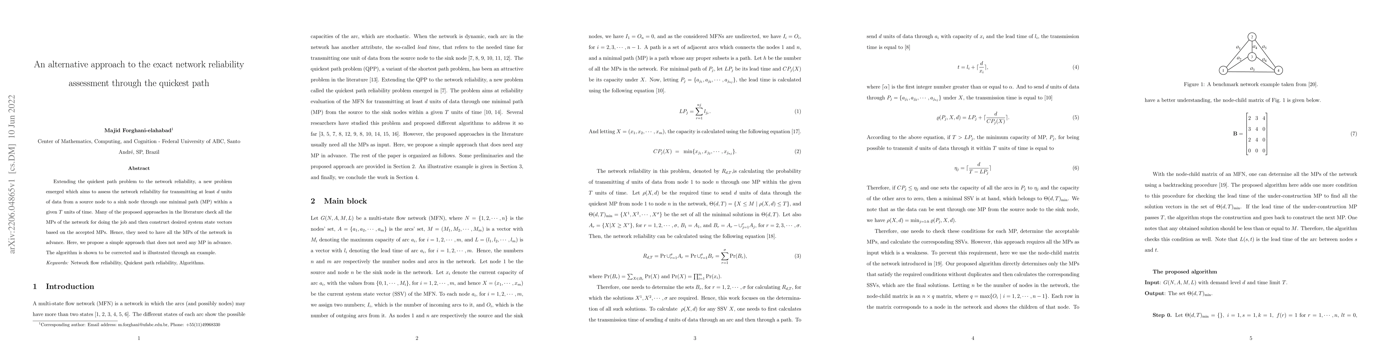 This paper proposes a novel method for assessing network reliability without the need for pre-existing minimal paths, focusing on the quickest path problem to transmit at least d units of data within T time units. The introduced algorithm is demonstrated to be correct and illustrated with an example.
