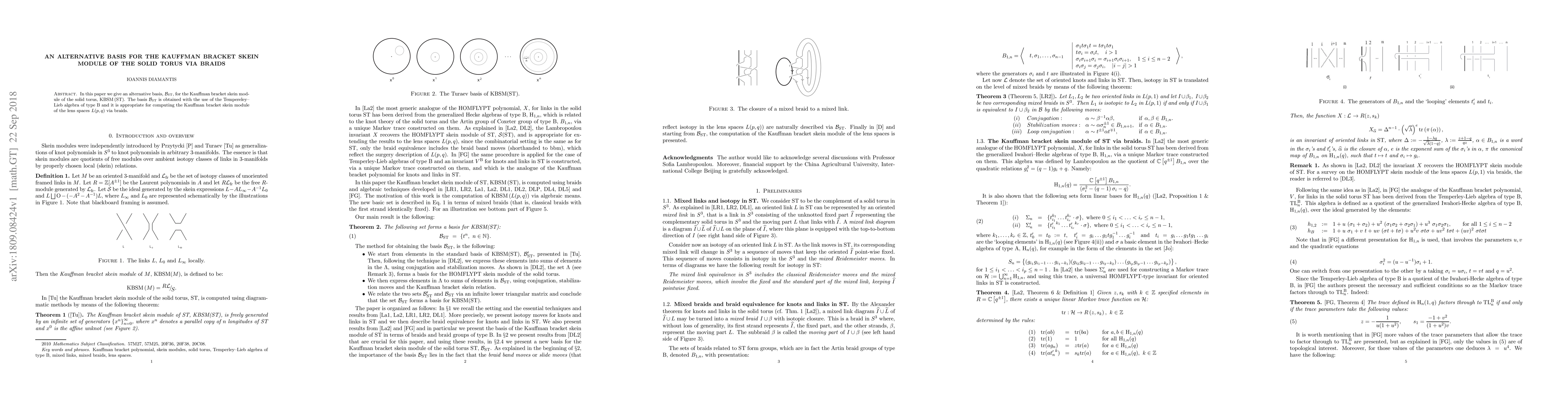In this paper we give an alternative basis, $\mathcal{B}_{\rm ST}$, for the Kauffman bracket skein module of the solid torus, ${\rm KBSM}\left({\rm ST}\right)$. The basis $\mathcal{B}_{\rm ST}$ is obtained with the use of the Tempereley--Lieb algebra of type B and it is appropriate for computing the Kauffman bracket skein module of the lens spaces $L(p, q)$ via braids.