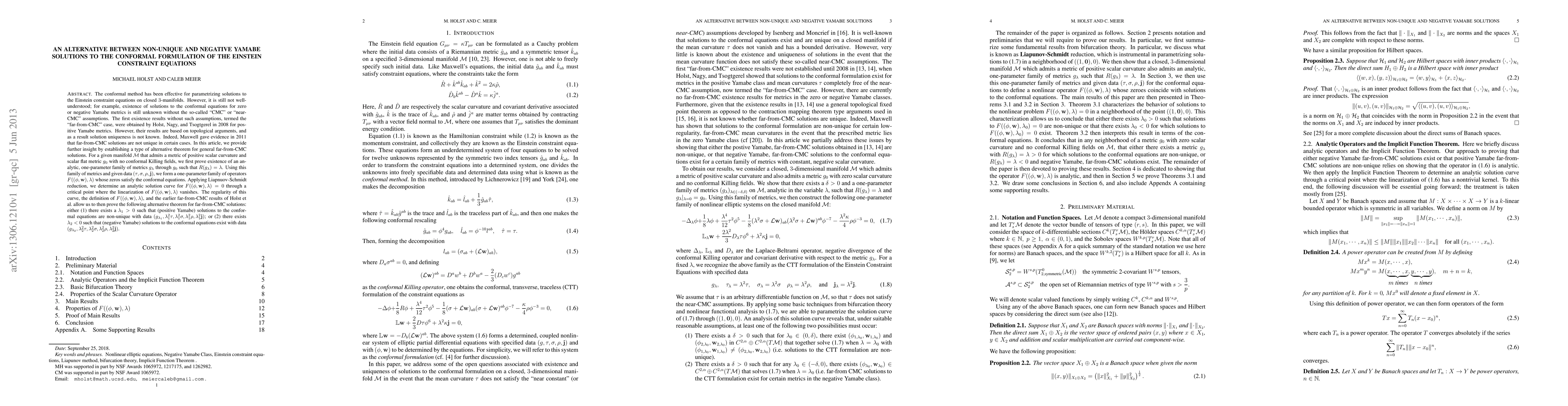 This paper establishes an alternative theorem for the existence of non-unique positive Yamabe solutions or negative Yamabe solutions to the conformal formulation of the Einstein constraint equations, without relying on "CMC" assumptions. It proves the existence of an analytic family of metrics and uses Liapnuov-Schmidt reduction to determine an analytic solution curve, leading to the conclusion that either non-unique positive Yamabe solutions exist or negative Yamabe solutions exist.
