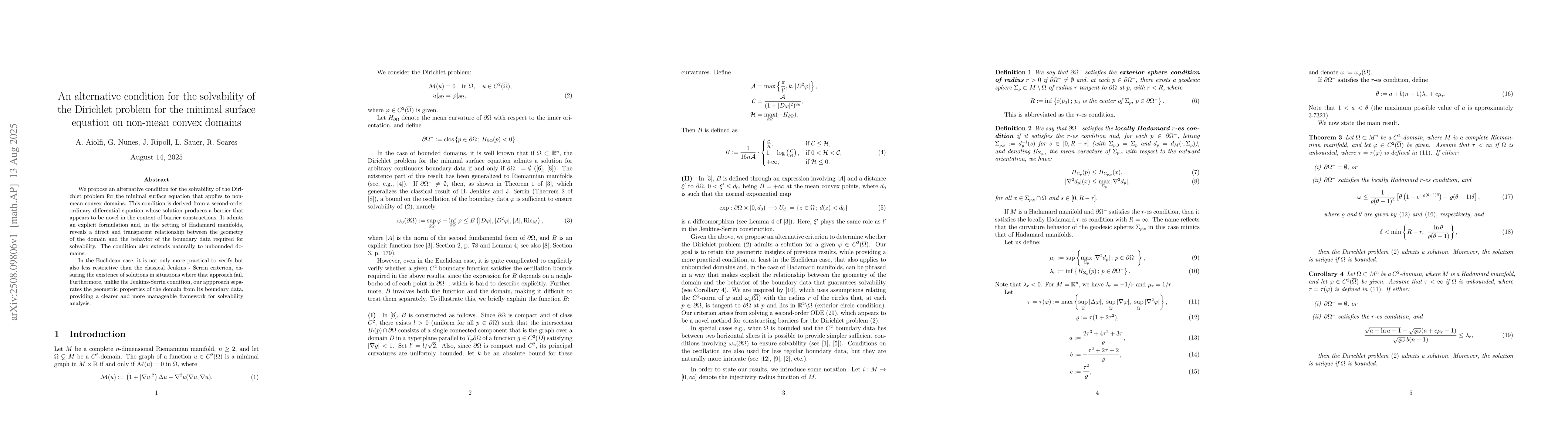 We propose an alternative condition for the solvability of the Dirichlet problem for the minimal surface equation that applies to non-mean convex domains. This condition is derived from a second-order ordinary differential equation whose solution produces a barrier that appears to be novel in the context of barrier constructions. It admits an explicit formulation and, in the setting of Hadamard manifolds, reveals a direct and transparent relationship between the geometry of the domain and the behavior of the boundary data required for solvability. The condition also extends naturally to unbounded domains. In the Euclidean case, it is not only more practical to verify but also less restrictive than the classical Jenkins - Serrin criterion, ensuring the existence of solutions in situations where that approach fail. Furthermore, unlike the Jenkins-Serrin condition, our appproach separates the geometric properties of the domain from its boundary data, providing a clearer and more manageable framework for solvability analysis.