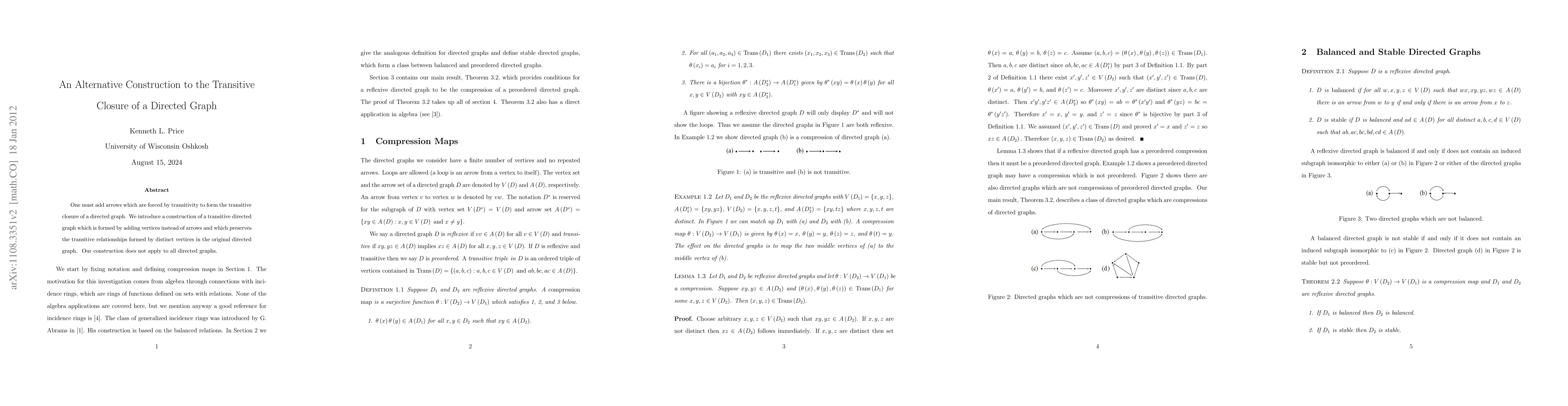 This paper proposes a novel method to construct the transitive closure of a directed graph by adding vertices rather than arrows, preserving transitive relationships. This alternative construction is not universally applicable but offers a unique approach for specific directed graphs.