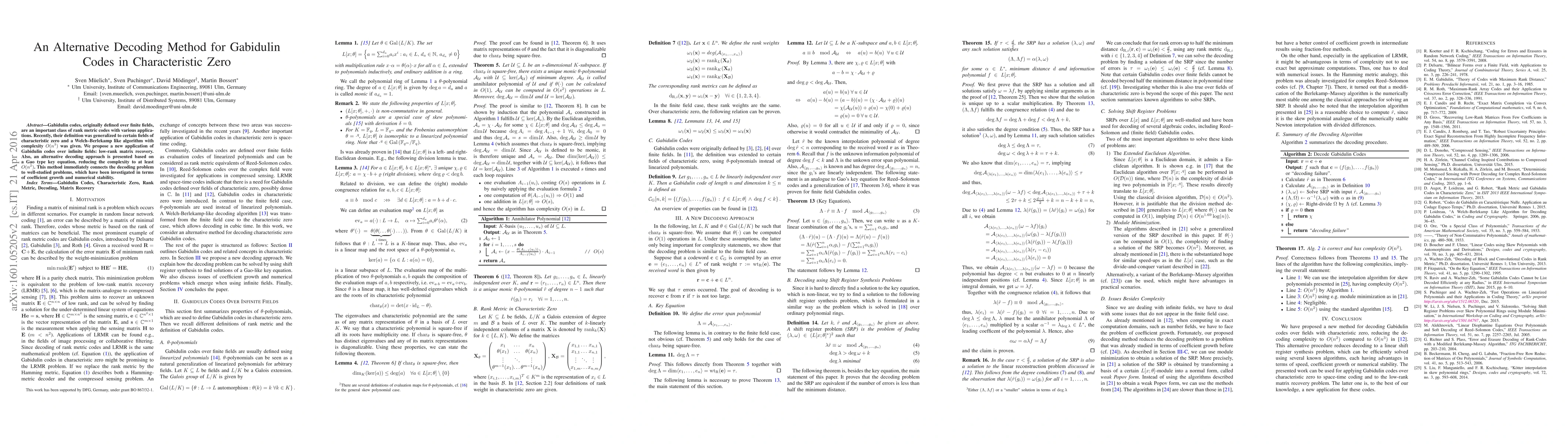 This paper proposes an alternative decoding method for Gabidulin codes in characteristic zero, reducing complexity from $O(n^3)$ to at least $O(n^2)$ using a Gao type key equation, and explores their application in low-rank matrix recovery.