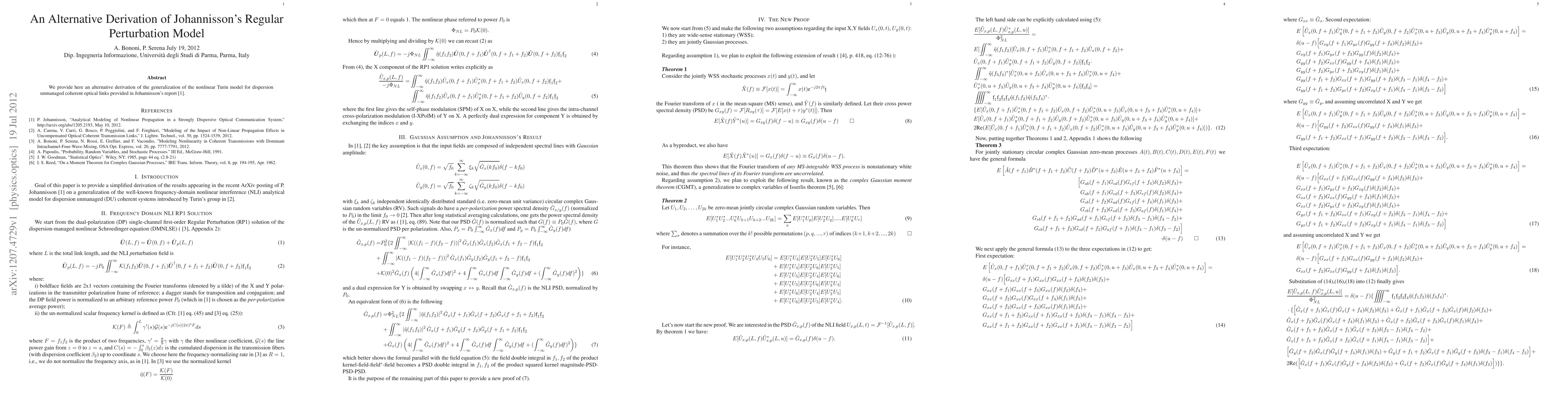 The paper presents an alternative derivation of Johannisson's regular perturbation model for dispersion unmanaged coherent optical links, starting from equation (5) and making assumptions of wide-sense stationarity (WSS) and joint Gaussianity of input fields Ux(0,t) and Uy(0,t).