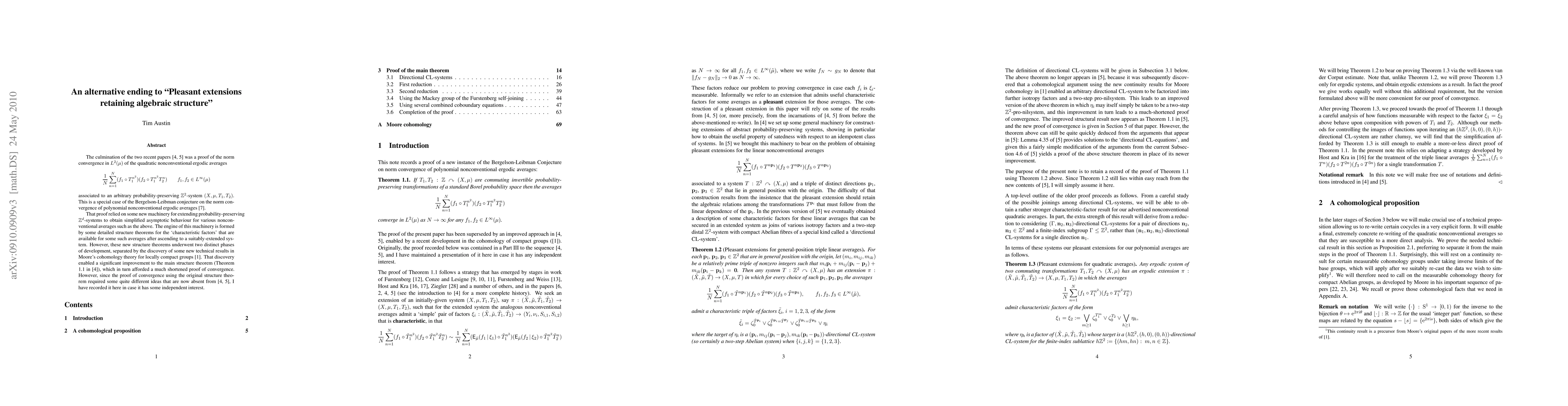 The culmination of the papers (arXiv:0905.0518, arXiv:0910.0909) was a proof of the norm convergence in $L^2(\mu)$ of the quadratic nonconventional ergodic averages \frac{1}{N}\sum_{n=1}^N(f_1\circ T_1^{n^2})(f_2\circ T_1^{n^2}T_2^n)\quad\quad f_1,f_2\in L^\infty(\mu) associated to an arbitrary probability-preserving \bbZ^2-system (X,\mu,T_1,T_2). This is a special case of the Bergelson-Leibman conjecture on the norm convergence of polynomial nonconventional ergodic averages. That proof relied on some new machinery for extending probability-preserving $\bbZ^d$-systems to obtain simplified asymptotic behaviour for various nonconventional averages such as the above. The engine of this machinery is formed by some detailed structure theorems for the `characteristic factors' that are available for some such averages after ascending to a suitably-extended system. However, these new structure theorems underwent two distinct phases of development, separated by the discovery of some new technical results in Moore's cohomology theory for locally compact groups (arXiv:1004.4937). That discovery enabled a significant improvement to the main structure theorem (Theorem 1.1 in (arXiv:0905.0518)), which in turn afforded a much shortened proof of convergence. However, since the proof of convergence using the original structure theorem required some quite different ideas that are now absent from these other papers, I have recorded it here in case it has some independent interest.