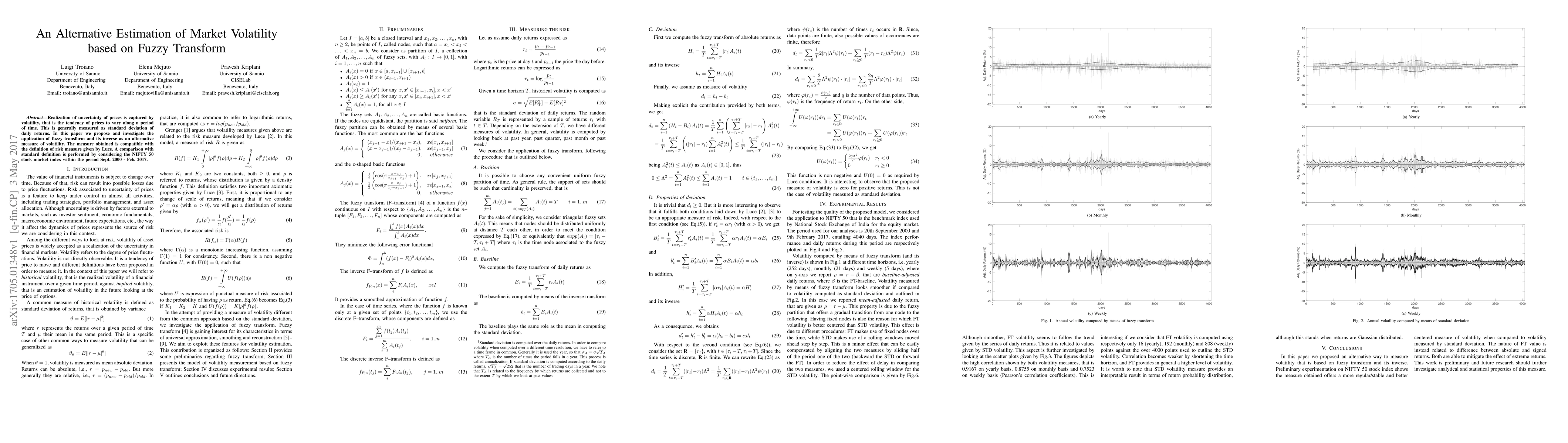 Realization of uncertainty of prices is captured by volatility, that is the tendency of prices to vary along a period of time. This is generally measured as standard deviation of daily returns. In this paper we propose and investigate the application of fuzzy transform and its inverse as an alternative measure of volatility. The measure obtained is compatible with the definition of risk measure given by Luce. A comparison with standard definition is performed by considering the NIFTY 50 stock market index within the period Sept. 2000 - Feb. 2017.