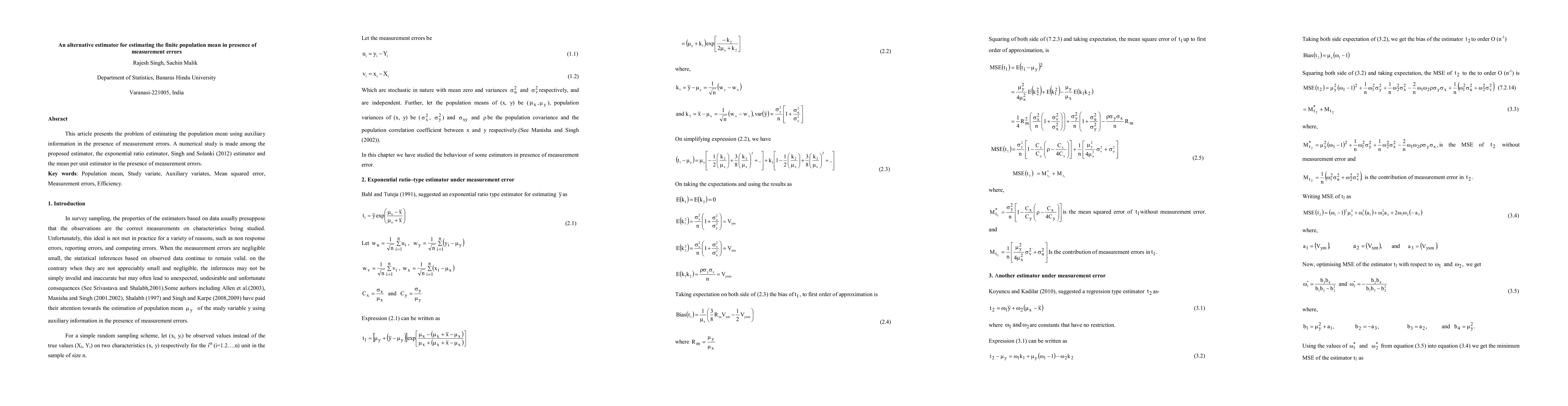 This paper proposes an alternative estimator for accurately determining the population mean amidst measurement errors, comparing its performance against existing methods like the exponential ratio estimator, Singh and Solanki (2012) estimator, and the mean per unit estimator through a numerical study. The study emphasizes efficiency and mean squared error in the presence of measurement errors.