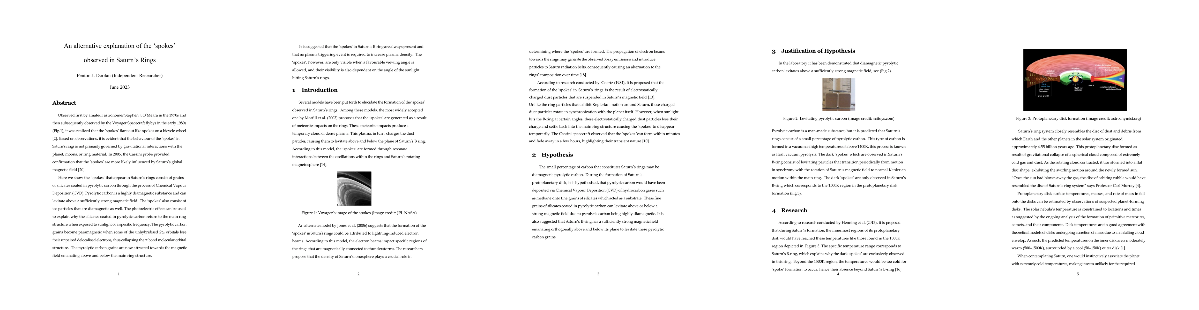 Observed first by amateur astronomer Stephen J. O'Meara in the 1970s and then subsequently observed by the Voyager Spacecraft flybys in the early 1980s, it was realised that the 'spokes' flare out like spokes on a bicycle wheel. The observed behaviour of the 'spokes' indicates that they are not governed by gravitational interactions with the planets, moons, or ring material. In 2005 the Cassini probe confirmed that the 'spokes' are likely under the influence of the gas giant's global magnetic field. Here we show that the 'spokes' that appear in Saturn's rings consist of grains of silicates coated in pyrolytic carbon through the process of Chemical Vapour Deposition (CVD). Pyrolytic carbon is a highly diamagnetic substance that can levitate above a sufficiently strong magnetic field. The 'spokes' also consist of ice particles that are diamagnetic as well. The photoelectric effect can be used to explain why the silicates coated in pyrolytic carbon return to the main ring structure when exposed to sunlight of a specific frequency. The pyrolytic carbon grains become paramagnetic when some of the unhybridised 2pz orbitals lose their unpaired delocalised electrons, thus collapsing the pi bond molecular orbital structure. The pyrolytic carbon grains are now attracted to the magnetic field emanating above and below the main ring structure. It is suggested that the 'spokes' in Saturn's B ring are always present and no plasma triggering event is required to increase plasma density. The 'spokes', however, are only visible when a favourable viewing angle is allowed, and their visibility is also dependent on the angle of the sunlight hitting Saturn's rings.
