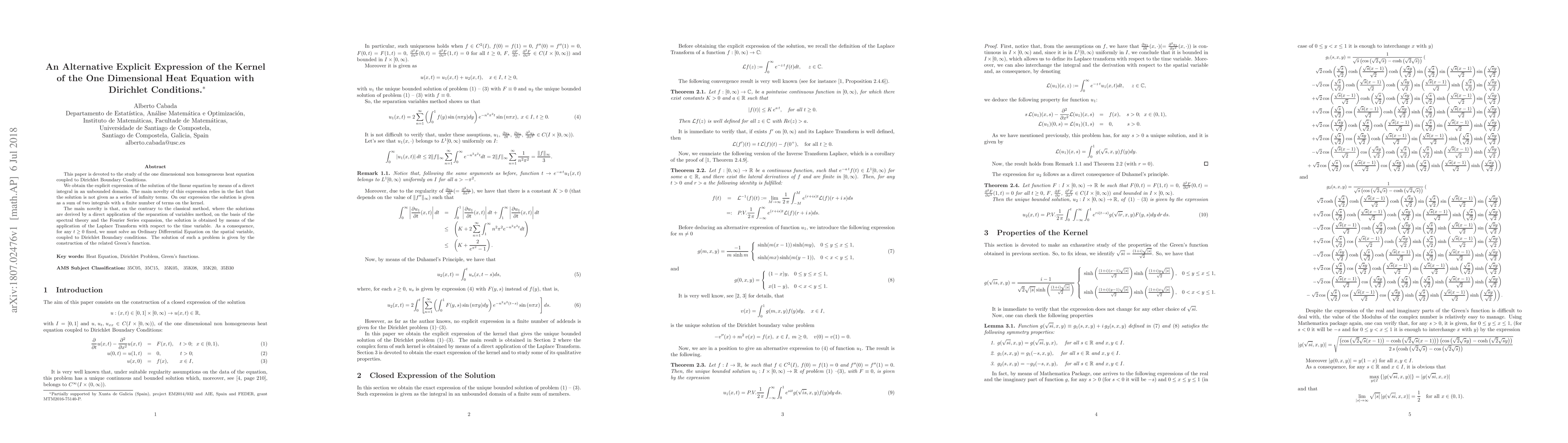 This paper is devoted to the study of the one dimensional non homogeneous heat equation coupled to Dirichlet Boundary Conditions. We obtain the explicit expression of the solution of the linear equation by means of a direct integral in an unbounded domain. The main novelty of this expression relies in the fact that the solution is not given as a series of infinity terms. On our expression the solution is given as a sum of two integrals with a finite number of terms on the kernel. The main novelty is that, on the contrary to the classical method, where the solutions are derived by a direct application of the separation of variables method, on the basis of the spectral theory and the Fourier Series expansion, the solution is obtained by means of the application of the Laplace Transform with respect to the time variable. As a consequence, for any $t \ge 0$ fixed, we must solve an Ordinary Differential Equation on the spatial variable, coupled to Dirichlet Boundary conditions. The solution of such a problem is given by the construction of the related Green's function.